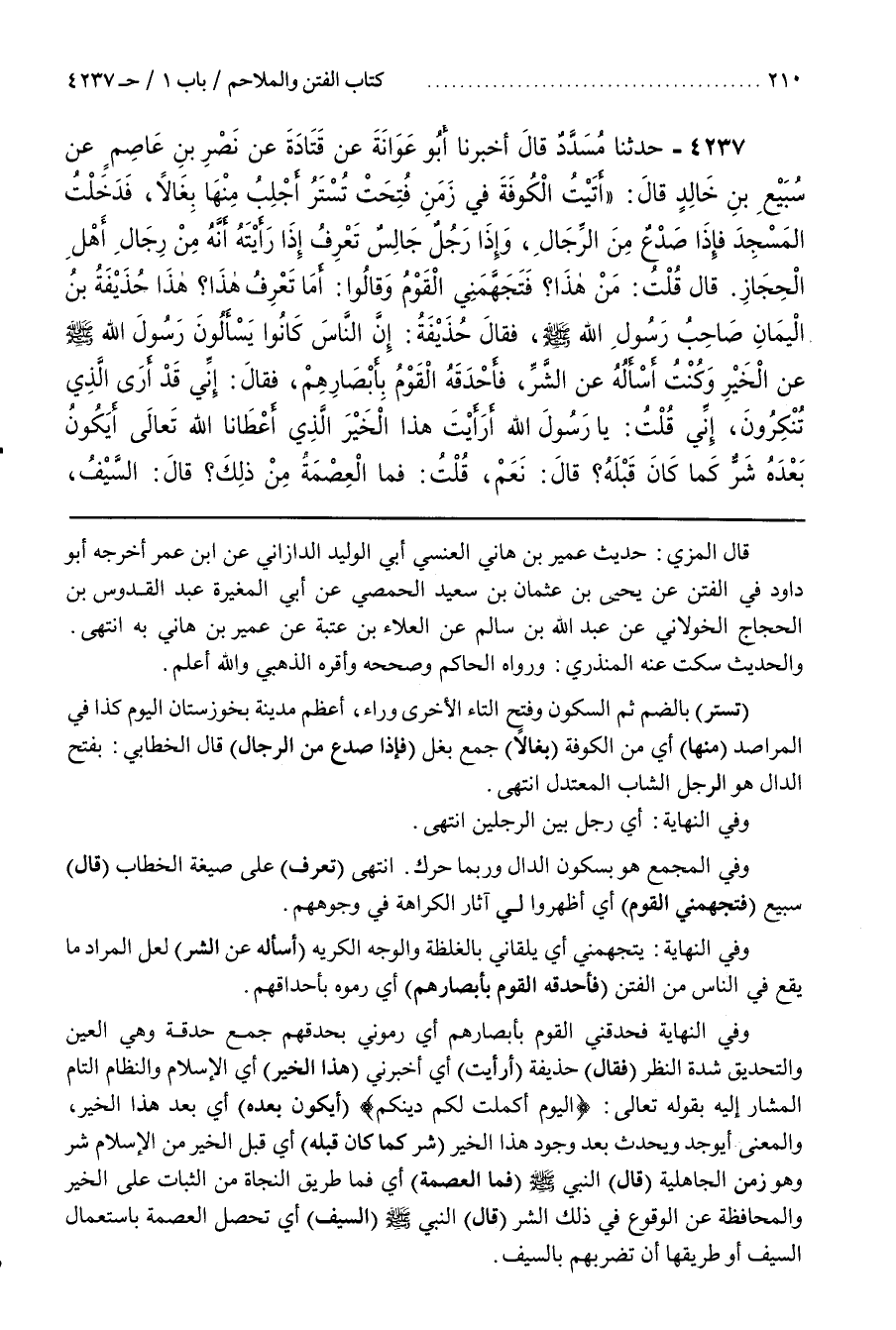 وَفِي النِّهَايَةِ فَحَدَقَنِي الْقَوْمُ بِأَبْصَارِهِمْ أَيْ رَمَوْنِي بِحَدَقِهِمْ جَمْعُ حَدَقَةٍ وَهِيَ الْعَيْنُ وَالتَّحْدِيقُ شِدَّةُ النَّظَرِ (فَقَالَ) حُذَيْفَةُ (أَرَأَيْتَ) أَيْ أَخْبِرْنِي (هَذَا الْخَيْرَ) أَيِ الْإِسْلَامَ وَالنِّظَامَ التَّامَّ الْمُشَارَ إِلَيْهِ بِقَوْلِهِ تعالى اليوم أكملت لكم دينكم (أَيَكُونُ بَعْدَهُ) أَيْ بَعْدَ هَذَا الْخَيْرِ وَالْمَعْنَى أَيُوجَدُ وَيَحْدُثُ بَعْدَ وُجُودِ هَذَا الْخَيْرِ (شَرٌّ كَمَا كَانَ قَبْلَهُ) أَيْ قَبْلَ الْخَيْرِ مِنَ الْإِسْلَامِ شَرٌّ وَهُوَ زَمَنُ الْجَاهِلِيَّةِ (قَالَ) النَّبِيُّ (فَمَا الْعِصْمَةُ) أَيْ فَمَا طَرِيقُ النَّجَاةِ مِنَ الثَّبَاتِ عَلَى الْخَيْرِ وَالْمُحَافَظَةِ عَنِ الْوُقُوعِ فِي ذلك الشر (قال) النبي (السَّيْفُ) أَيْ تَحْصُلُ الْعِصْمَةُ بِاسْتِعْمَالِ السَّيْفِ أَوْ طَرِيقِهَا أَنْ تَضْرِبَهُمْ بِالسَّيْفِ