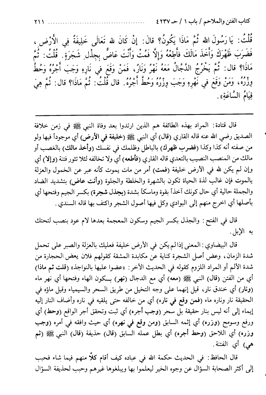 قَالَ الْبَيْضَاوِيُّ الْمَعْنَى إِذَا لَمْ يَكُنْ فِي الْأَرْضِ خَلِيفَةٌ فَعَلَيْكَ بِالْعُزْلَةِ وَالصَّبْرِ عَلَى تَحَمُّلِ شِدَّةِ الزَّمَانِ وَعَضُّ أَصْلِ الشَّجَرَةِ كِنَايَةٌ عَنْ مُكَابَدَةِ الْمَشَقَّةِ كَقَوْلِهِمْ فُلَانٌ يَعَضُّ الْحِجَارَةَ مِنْ شِدَّةِ الْأَلَمِ أَوِ الْمُرَادُ اللُّزُومُ كَقَوْلِهِ فِي الْحَدِيثِ الْآخَرِ عَضُّوا عَلَيْهَا بِالنَّوَاجِذِ (قُلْتُ ثُمَّ مَاذَا) أي من الفتن (قال) النبي (مَعَهُ) أَيْ مَعَ الدَّجَّالِ (نَهْرٌ) بِسُكُونِ الْهَاءِ وَفَتْحِهَا أَيْ نَهْرُ مَاءٍ (وَنَارٌ) أَيْ خَنْدَقُ نَارٍ قِيلَ إِنَّهُمَا عَلَى وَجْهِ التَّخَيُّلِ مِنْ طَرِيقِ السِّحْرِ وَالسِّيمِيَاءِ وَقِيلَ مَاؤُهُ فِي الْحَقِيقَةِ نَارٌ وَنَارُهُ مَاءٌ (فَمَنْ وَقَعَ فِي نَارِهِ) أَيْ مَنْ خَالَفَهُ حَتَّى يُلْقِيَهُ فِي نَارِهِ وَأَضَافَ النَّارَ إِلَيْهِ إِيمَاءً إِلَى أَنَّهُ لَيْسَ بِنَارٍ حَقِيقَةً بَلْ سِحْرٍ (وَجَبَ أَجْرُهُ) أَيْ ثَبَتَ وَتَحَقَّقَ أَجْرُ الْوَاقِعِ (وَحُطَّ) أَيْ وَرُفِعَ وَسُومِحَ (وِزْرُهُ) أَيْ إِثْمُهُ السَّابِقُ (وَمَنْ وَقَعَ في نهره) أي حديث وَافَقَهُ فِي أَمْرِهِ (وَجَبَ وِزْرُهُ) أَيِ اللَّاحِقُ (وَحُطَّ أَجْرُهُ) أَيْ بَطَلَ عَمَلُهُ السَّابِقُ (قَالَ) حذيفة (قال) النبي (ثُمَّ هِيَ) أَيِ الْفِتْنَةُ
