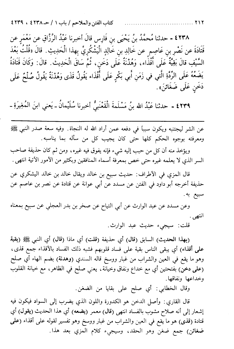 [4245] (بِهَذَا الْحَدِيثِ) السَّابِقِ (قَالَ) أَيْ حُذَيْفَةُ (قُلْتُ) أَيْ مَاذَا (قَالَ) أَيِ النَّبِيُّ (بَقِيَّةٌ عَلَى أَقْذَاءٍ) أَيْ يَبْقَى النَّاسُ بَقِيَّةً عَلَى فَسَادِ قُلُوبِهِمْ فَشَبَّهَ ذَلِكَ الْفَسَادَ بِالْأَقْذَاءِ جَمْعُ قَذًى وَهُوَ مَا يَقَعُ فِي الْعَيْنِ وَالشَّرَابِ مِنْ غُبَارٍ وَوَسَخٍ قَالَهُ السِّنْدِيُّ (وَهُدْنَةٌ) بِضَمِّ الْهَاءِ أَيْ صُلْحٌ (عَلَى دَخَنٍ) بِفَتْحَتَيْنِ أي مع خداع ونفاق وخيانة يعني صلح فِي الظَّاهِرِ مَعَ خِيَانَةِ الْقُلُوبِ وَخِدَاعِهَا وَنِفَاقِهَا