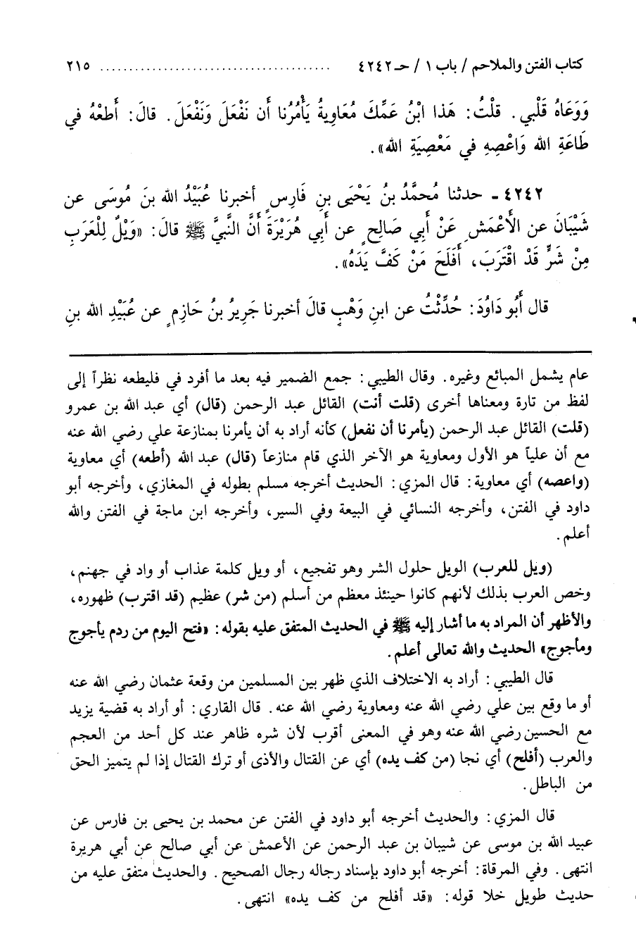 قَالَ الْمِزِّيُّ وَالْحَدِيثُ أَخْرَجَهُ أَبُو دَاوُدَ فِي الْفِتَنِ عَنْ مُحَمَّدِ بْنِ يَحْيَى بْنِ فَارِسٍ عَنِ عُبَيْدِ اللَّهِ بْنِ مُوسَى عَنْ شَيْبَانَ بْنِ عَبْدِ الرَّحْمَنِ عَنِ الْأَعْمَشُ عَنْ أَبِي صَالِحٍ عَنْ أَبِي هُرَيْرَةَ انْتَهَى