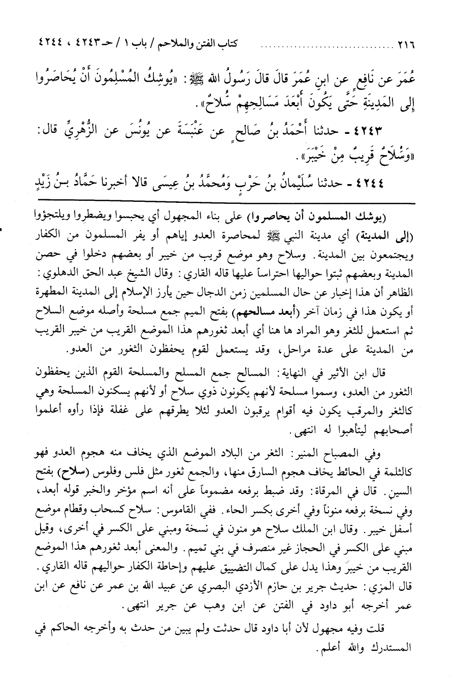 وَقَالَ الشَّيْخُ عَبْدُ الْحَقِّ الدَّهْلَوِيُّ الظَّاهِرُ أَنَّ هَذَا إِخْبَارٌ عَنْ حَالِ الْمُسْلِمِينَ زَمَنَ الدَّجَّالِ حِينَ يَأْرِزُ الْإِسْلَامُ إِلَى الْمَدِينَةِ الْمُطَهَّرَةِ أَوْ يَكُونُ هَذَا فِي زَمَانٍ آخَرَ (أَبْعَدَ مَسَالِحِهِمْ) بِفَتْحِ الْمِيمِ جَمْعُ مَسْلَحَةٍ وَأَصْلُهُ مَوْضِعُ السِّلَاحِ ثم استعمل للثغر وهو المراد ها هنا أَيْ أَبْعَدُ ثُغُورِهِمْ هَذَا الْمَوْضِعُ الْقَرِيبُ مِنْ خَيْبَرَ الْقَرِيبُ مِنَ الْمَدِينَةِ عَلَى عِدَّةِ مَرَاحِلَ وَقَدْ يُسْتَعْمَلُ لِقَوْمٍ يَحْفَظُونَ الثُّغُورَ مِنَ الْعَدُوِّ
