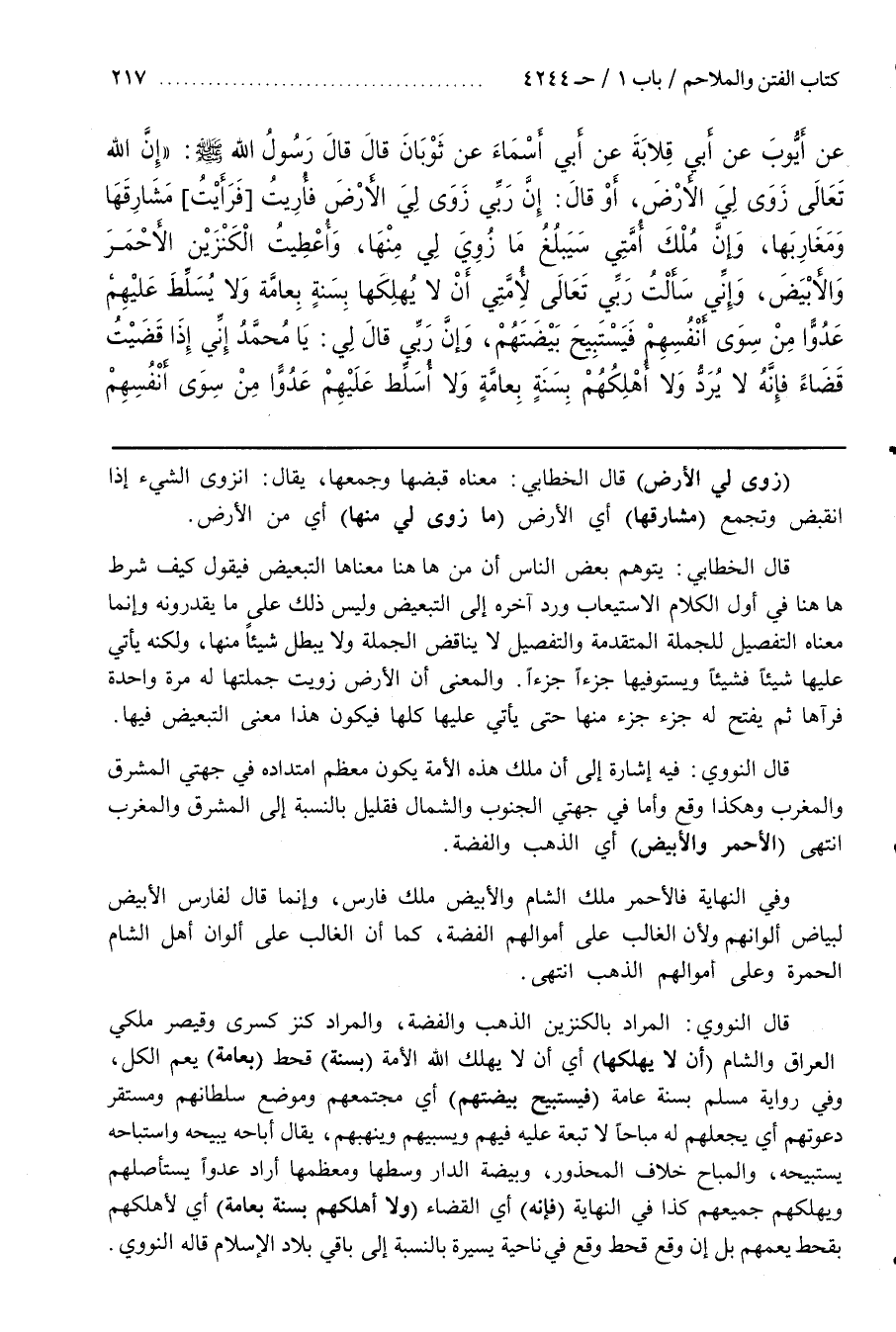 [4252] (زَوَى لِيَ الْأَرْضَ) قَالَ الْخَطَّابِيُّ مَعْنَاهُ قَبَضَهَا وَجَمَعَهَا يُقَالُ انْزَوَى الشَّيْءُ إِذَا انْقَبَضَ وَتَجَمَّعَ (مَشَارِقَهَا) أَيِ الْأَرْضِ (مَا زُوِيَ لِي مِنْهَا) أَيْ مِنَ الْأَرْضِ