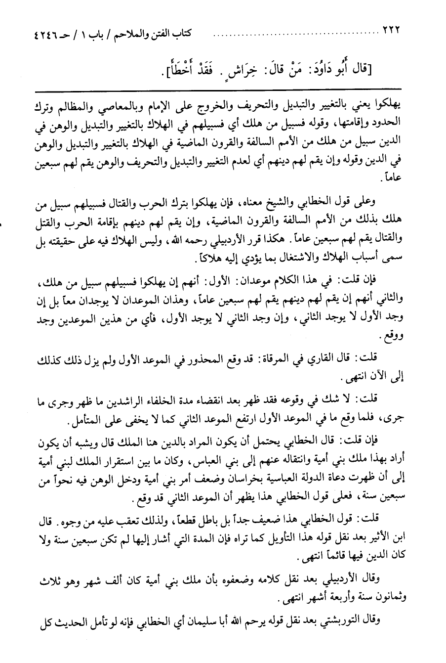 فَإِنْ قُلْتَ قَالَ الْخَطَّابِيُّ يَحْتَمِلُ أَنْ يَكُونَ الْمُرَادُ بِالدِّينِ هُنَا الْمُلْكُ قَالَ وَيُشْبِهُ أَنْ يَكُونَ أَرَادَ بِهَذَا مُلْكَ بَنِي أُمَيَّةَ وَانْتِقَالَهُ عَنْهُمْ إِلَى بَنِي الْعَبَّاسِ وَكَانَ مَا بَيْنَ اسْتِقْرَارِ الْمُلْكِ لِبَنِي أُمَيَّةَ إِلَى أَنْ ظَهَرَتْ دُعَاةُ الدَّوْلَةِ الْعَبَّاسِيَّةِ بِخُرَاسَانَ وَضَعُفَ أَمْرُ بَنِي أُمَيَّةَ وَدَخَلَ الْوَهْنُ فِيهِ نَحْوًا مِنْ سَبْعِينَ سَنَةٍ فَعَلَى قَوْلِ الْخَطَّابِيِّ هَذَا يَظْهَرُ أَنَّ الْمَوْعِدَ الثَّانِي قَدْ وَقَعَ