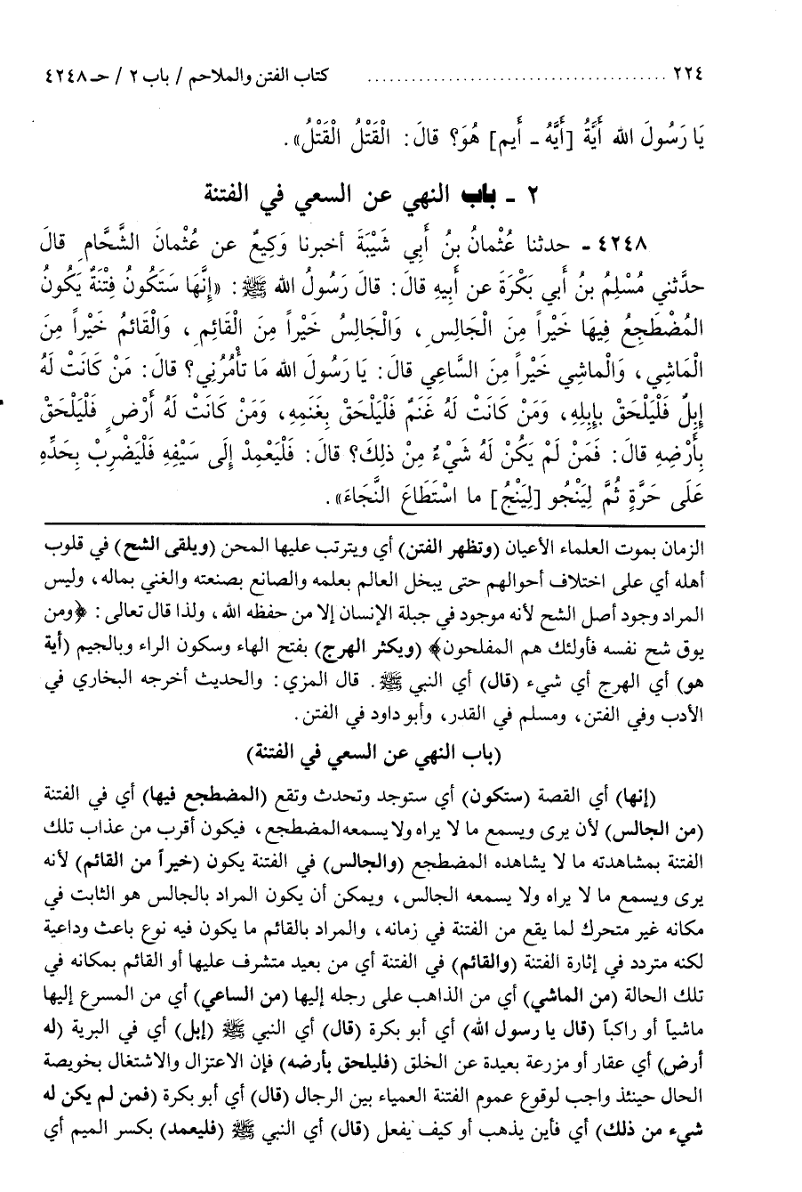 [4256] (إِنَّهَا) أَيِ الْقِصَّةَ (سَتَكُونُ) أَيْ سَتُوجَدُ وَتَحْدُثُ وَتَقَعُ (الْمُضْطَجِعُ فِيهَا) أَيْ فِي الْفِتْنَةِ (مِنَ الْجَالِسِ) لِأَنَّهُ يَرَى وَيَسْمَعُ مَا لَا يَرَاهُ وَلَا يَسْمَعُهُ الْمُضْطَجِعُ فَيَكُونُ أَقْرَبَ مِنْ عَذَابِ تِلْكَ الْفِتْنَةِ بِمُشَاهَدَتِهِ مَا لَا يُشَاهِدُهُ الْمُضْطَجِعُ (وَالْجَالِسُ) فِي الْفِتْنَةِ يَكُونُ (خَيْرًا مِنَ الْقَائِمِ) لِأَنَّهُ يَرَى وَيَسْمَعُ مَا لَا يَرَاهُ وَلَا يَسْمَعُهُ الْجَالِسُ وَيُمْكِنُ أَنْ يَكُونَ الْمُرَادُ بِالْجَالِسِ هُوَ الثَّابِتُ فِي مَكَانِهِ غَيْرَ مُتَحَرِّكٍ لِمَا يَقَعُ مِنَ الْفِتْنَةِ فِي زَمَانِهِ وَالْمُرَادُ بِالْقَائِمِ مَا يَكُونُ فِيهِ نَوْعٌ بَاعِثٌ وَدَاعِيَةٌ لَكِنَّهُ مُتَرَدِّدٌ فِي إِثَارَةِ الْفِتْنَةِ (وَالْقَائِمُ) فِي الْفِتْنَةِ أَيْ مِنْ بَعِيدٍ مُتَشَرِّفٌ عَلَيْهَا أَوِ الْقَائِمُ بِمَكَانِهِ فِي تِلْكَ الْحَالَةِ (مِنَ الْمَاشِي) أَيْ مِنَ الذَّاهِبِ عَلَى رِجْلِهِ إِلَيْهَا (مِنَ السَّاعِي) أَيْ مِنَ الْمُسْرِعِ إِلَيْهَا مَاشِيًا أَوْ رَاكِبًا (قَالَ يَا رَسُولَ اللَّهِ) أَيْ أَبُو بَكْرَةَ (قَالَ) أَيِ النَّبِيُّ صَلَّى اللَّهُ عَلَيْهِ وَسَلَّمَ (إِبِلٌ) أَيْ فِي الْبَرِيَّةِ (لَهُ أَرْضٌ) أَيْ عَقَارٌ أَوْ مَزْرَعَةٌ بَعِيدَةٌ عَنِ الْخَلْقِ (فَلْيَلْحَقْ بِأَرْضِهِ) فَإِنَّ الِاعْتِزَالَ وَالِاشْتِغَالَ بِخُوَيْصَةِ الْحَالِ حِينَئِذٍ وَاجِبٌ لِوُقُوعِ عُمُومِ الْفِتْنَةِ الْعَمْيَاءِ بَيْنَ الرِّجَالِ (قَالَ) أَيْ أَبُو بَكْرَةَ (فَمَنْ لَمْ يَكُنْ لَهُ شَيْءٌ مِنْ ذَلِكَ) أَيْ فَأَيْنَ يَذْهَبُ وَكَيْفَ يَفْعَلُ (قَالَ) أَيِ النَّبِيُّ صَلَّى اللَّهُ عَلَيْهِ وَسَلَّمَ (فَلْيَعْمِدْ) بِكَسْرِ الْمِيمِ أَيْ