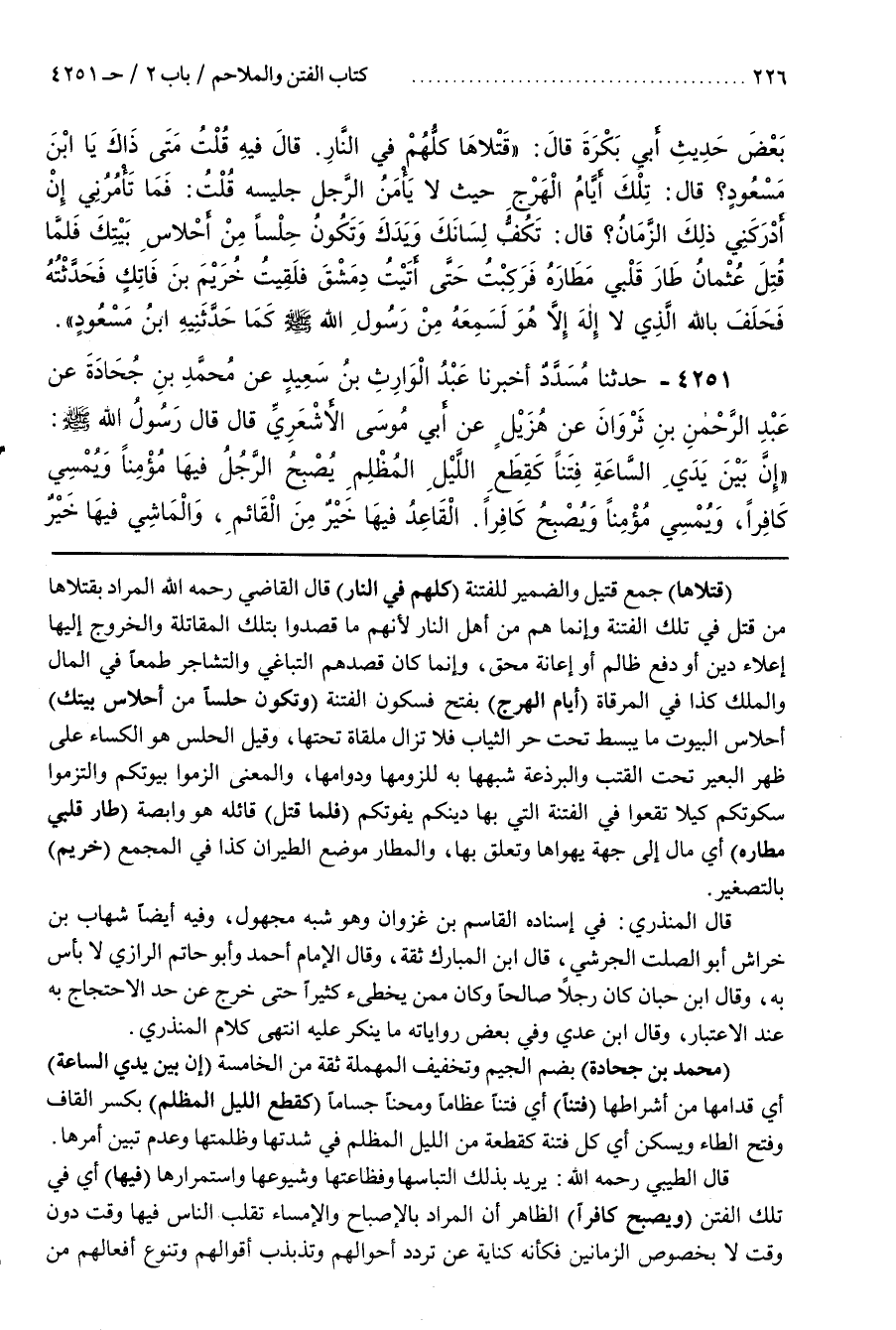 [4259] (مُحَمَّدُ بْنُ جُحَادَةَ) بِضَمِّ الْجِيمِ وَتَخْفِيفِ الْمُهْمَلَةِ ثِقَةٌ مِنَ الْخَامِسَةِ (إِنَّ بَيْنَ يَدَيِ السَّاعَةِ) أَيْ قُدَّامَهَا مِنْ أَشْرَاطِهَا (فِتَنًا) أَيْ فِتَنًا عِظَامًا وَمِحَنًا جِسَامًا (كَقِطَعِ اللَّيْلِ الْمُظْلِمِ) بِكَسْرِ الْقَافِ وَفَتْحِ الطَّاءِ وَيُسَكَّنُ أَيْ كُلُّ فِتْنَةٍ كَقِطْعَةٍ مِنِ اللَّيْلِ الْمُظْلِمِ فِي شِدَّتِهَا وَظُلْمَتِهَا وَعَدَمِ تَبَيُّنِ أَمْرِهَا