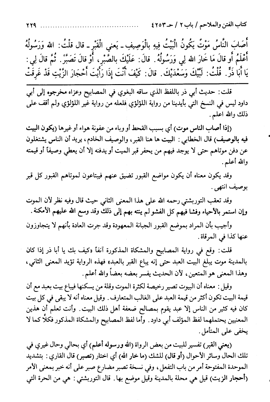 قُلْتُ وَقَعَ فِي رِوَايَةِ الْمَصَابِيحِ وَالْمِشْكَاةِ الْمَذْكُورَةِ آنِفًا كَيْفَ بِكَ يَا أَبَا ذَرٍّ إِذَا كَانَ بِالْمَدِينَةِ مَوْتٌ يَبْلُغُ الْبَيْتَ الْعَبْدُ حَتَّى إِنَّهُ يُبَاعُ الْقَبْرُ بِالْعَبْدِ فَهَذِهِ الرِّوَايَةُ تُؤَيِّدُ الْمَعْنَى الثَّانِي وَهَذَا الْمَعْنَى هُوَ الْمُتَعَيَّنُ لِأَنَّ الْحَدِيثَ يُفَسِّرُ بَعْضُهُ بَعْضًا وَاللَّهُ أَعْلَمُ