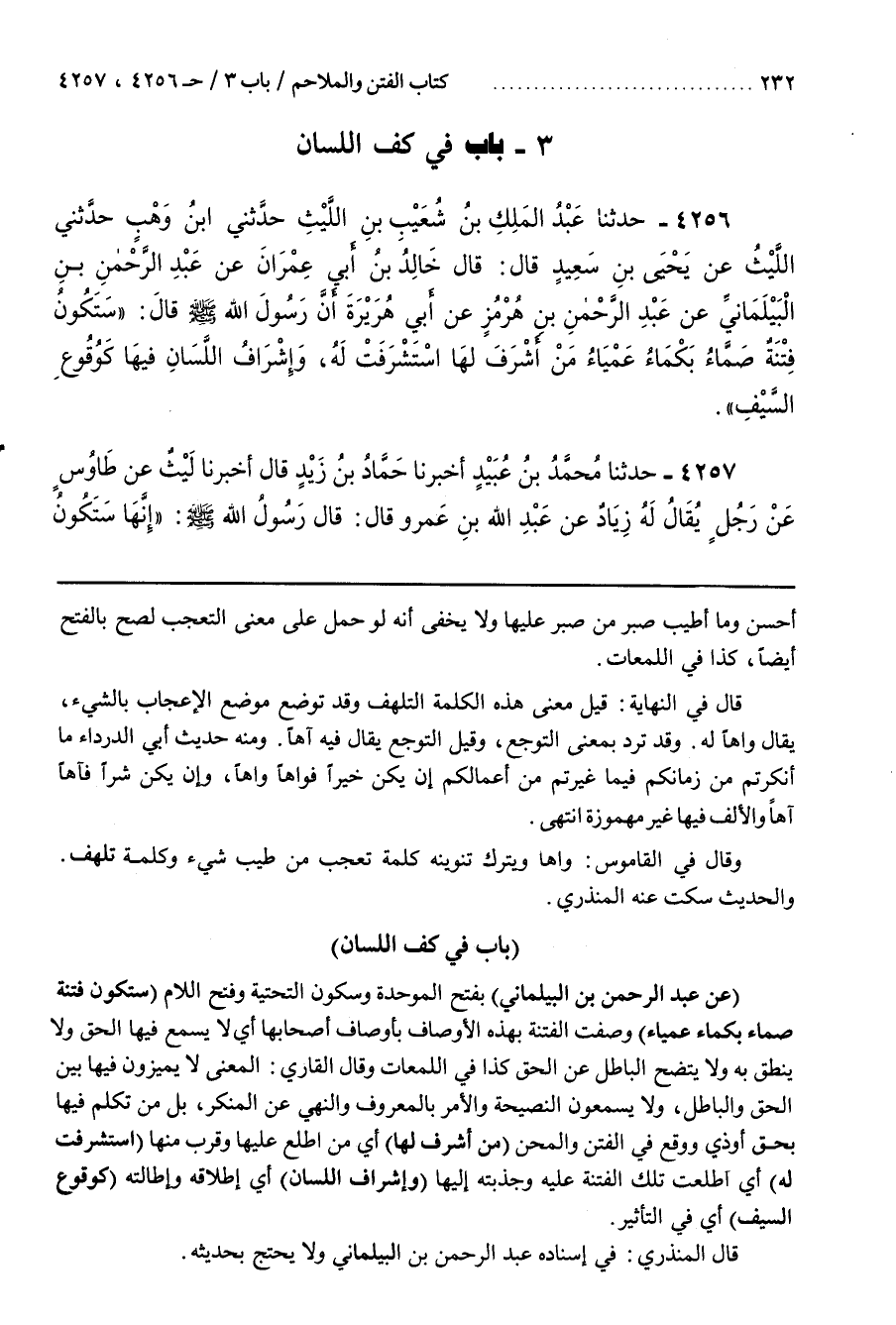 [4264] (عَنْ عَبْدِ الرَّحْمَنِ بْنِ الْبَيْلَمَانِيِّ) بِفَتْحِ الْمُوَحَّدَةِ وَسُكُونِ التَّحْتِيَّةِ وَفَتْحِ اللَّامِ (سَتَكُونُ فِتْنَةٌ صَمَّاءُ بَكْمَاءُ عَمْيَاءُ) وُصِفَتِ الْفِتْنَةُ بِهَذِهِ الْأَوْصَافِ بِأَوْصَافِ أَصْحَابِهَا أَيْ لَا يُسْمَعُ فِيهَا الْحَقُّ وَلَا يُنْطَقُ بِهِ وَلَا يَتَّضِحُ الباطل عن الحق كذا في اللمعات وقال القارىء الْمَعْنَى لَا يُمَيِّزُونَ فِيهَا بَيْنَ الْحَقِّ وَالْبَاطِلِ وَلَا يَسْمَعُونَ النَّصِيحَةَ وَالْأَمْرَ بِالْمَعْرُوفِ وَالنَّهْيَ عَنِ المنكر بل من تكلم فيها بحق أو ذي وَوَقَعَ فِي الْفِتَنِ وَالْمِحَنِ (مَنْ أَشْرَفَ لَهَا) أَيْ مَنِ اطَّلَعَ عَلَيْهَا وَقَرُبَ مِنْهَا (اسْتَشْرَفَتْ لَهُ) أَيِ اطَّلَعَتْ تِلْكَ الْفِتْنَةُ عَلَيْهِ وَجَذَبَتْهُ إِلَيْهَا (وَإِشْرَافُ اللِّسَانِ) أَيْ إِطْلَاقُهُ وَإِطَالَتُهُ (كَوُقُوعِ السَّيْفِ) أَيْ فِي التَّأْثِيرِ
