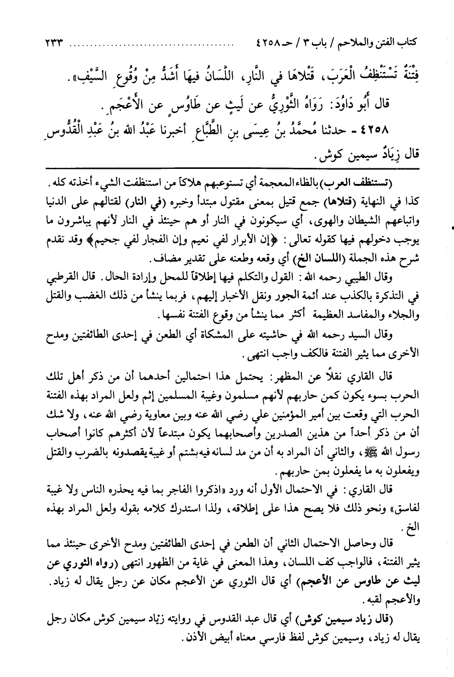 وَقَالَ السَّيِّدُ رَحِمَهُ اللَّهُ فِي حَاشِيَتِهِ عَلَى الْمِشْكَاةِ أَيِ الطَّعْنُ فِي إِحْدَى الطَّائِفَتَيْنِ وَمَدْحُ الْأُخْرَى مِمَّا يثير الفتنة فالكف واجب انتهى