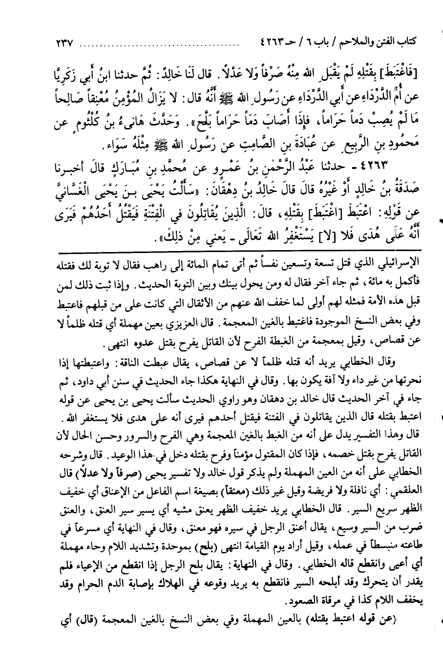 وَقَالَ فِي النِّهَايَةِ هَكَذَا جَاءَ الْحَدِيثُ فِي سُنَنِ أَبِي دَاوُدَ ثُمَّ جَاءَ فِي آخِرِ الْحَدِيثِ قَالَ خَالِدُ بْنُ دِهْقَانَ وَهُوَ رَاوِي الْحَدِيثِ سَأَلْتُ يَحْيَى بْنَ يَحْيَى عَنْ قَوْلِهِ اعْتَبَطَ بِقَتْلِهِ قَالَ الَّذِينَ يُقَاتِلُونَ فِي الْفِتْنَةِ فَيَقْتُلُ أَحَدُهُمْ فَيَرَى أَنَّهُ عَلَى هُدًى فَلَا يَسْتَغْفِرُ اللَّهَ
