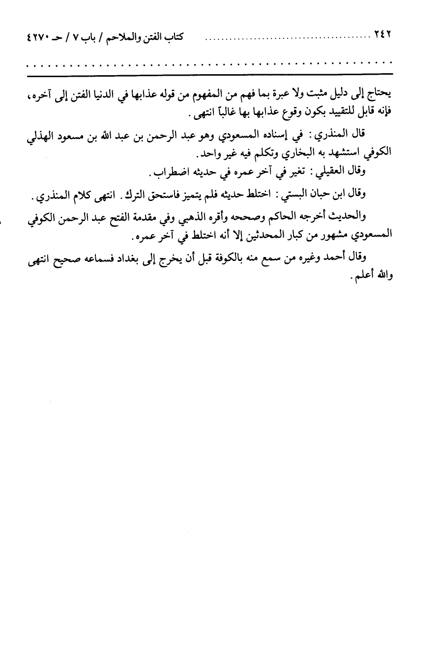 وَالْحَدِيثُ أَخْرَجَهُ الْحَاكِمُ وَصَحَّحَهُ وَأَقَرَّهُ الذَّهَبِيُّ وَفِي مُقَدِّمَةِ الْفَتْحِ عَبْدُ الرَّحْمَنِ الْكُوفِيُّ الْمَسْعُودِيُّ مَشْهُورٌ مِنْ كِبَارِ الْمُحَدِّثِينَ إِلَّا أَنَّهُ اخْتَلَطَ فِي آخِرِ عُمُرِهِ