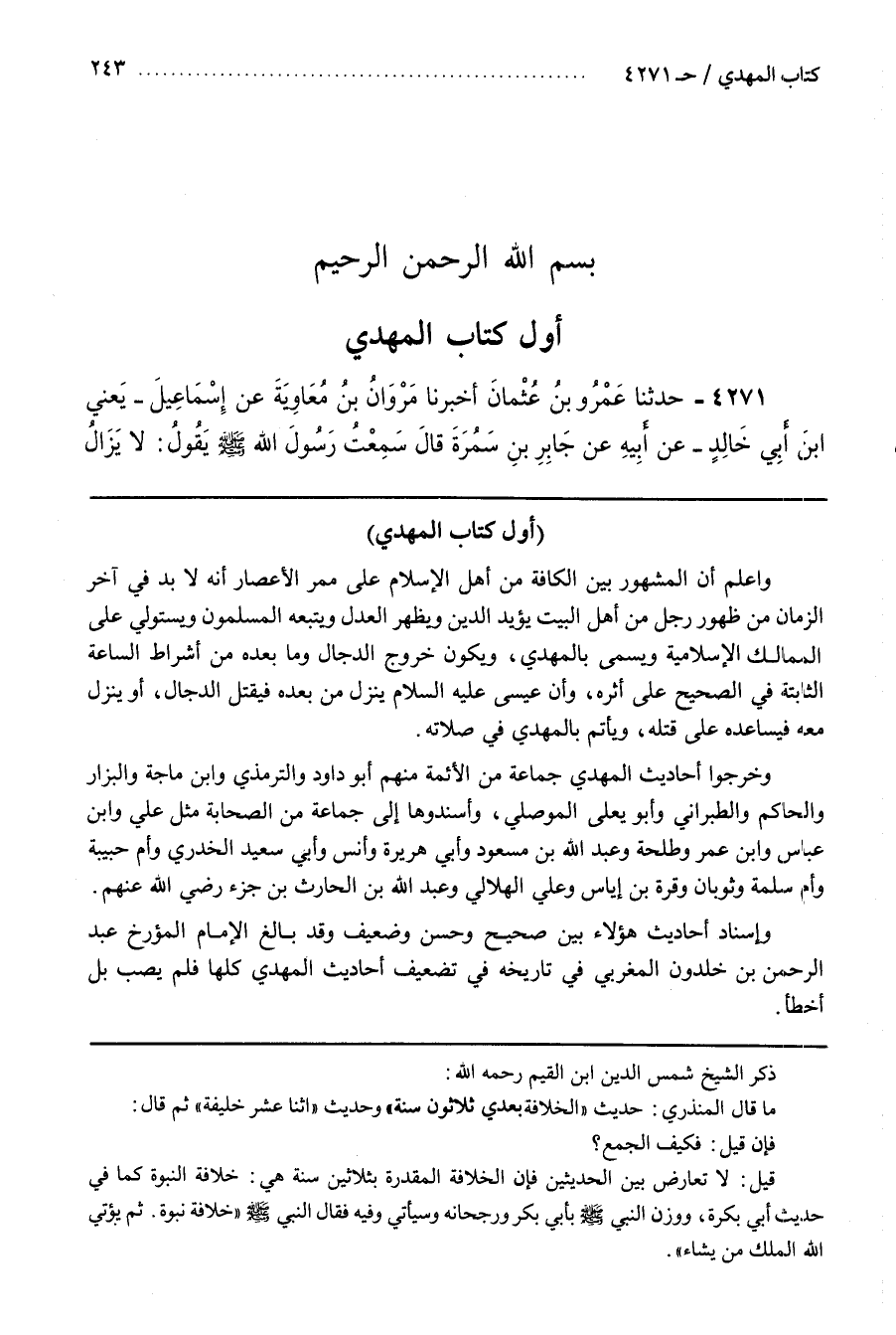 وَاعْلَمْ أَنَّ الْمَشْهُورَ بَيْنَ الْكَافَّةِ مِنْ أَهْلِ الْإِسْلَامِ عَلَى مَمَرِّ الْأَعْصَارِ أَنَّهُ لَا بُدَّ فِي آخِرِ الزَّمَانِ مِنْ ظُهُورِ رَجُلٍ مِنْ أَهْلِ الْبَيْتِ يُؤَيِّدُ الدِّينَ وَيُظْهِرُ الْعَدْلَ وَيَتَّبِعُهُ الْمُسْلِمُونَ وَيَسْتَوْلِي عَلَى الْمَمَالِكِ الْإِسْلَامِيَّةِ وَيُسَمَّى بِالْمَهْدِيِّ وَيَكُونُ خُرُوجُ الدَّجَّالِ وَمَا بَعْدَهُ مِنْ أَشْرَاطِ السَّاعَةِ الثَّابِتَةِ فِي الصَّحِيحِ عَلَى أَثَرِهِ وَأَنَّ عِيسَى عَلَيْهِ السَّلَامُ يَنْزِلُ مِنْ بَعْدِهِ فَيَقْتُلُ الدَّجَّالَ أَوْ يَنْزِلُ مَعَهُ فَيُسَاعِدُهُ عَلَى قَتْلِهِ وَيَأْتَمُّ بِالْمَهْدِيِّ فِي صَلَاتِهِ وَخَرَّجُوا أَحَادِيثَ الْمَهْدِيِّ جَمَاعَةٌ مِنَ الْأَئِمَّةِ مِنْهُمْ أَبُو داود والترمذي وبن مَاجَهْ وَالْبَزَّارُ وَالْحَاكِمُ وَالطَّبَرَانِيُّ وَأَبُو يَعْلَى الْمُوصِلِيُّ وَأَسْنَدُوهَا إِلَى جَمَاعَةٍ مِنَ الصَّحَابَةِ مِثْلَ عَلِيٍّ وبن عباس وبن عُمَرَ وَطَلْحَةَ وَعَبْدِ اللَّهِ بْنِ مَسْعُودٍ وَأَبِي هُرَيْرَةَ وَأَنَسٍ وَأَبِي سَعِيدٍ الْخُدْرِيِّ وَأُمِّ حَبِيبَةَ وَأُمِّ سَلَمَةَ وَثَوْبَانَ وَقُرَّةَ بْنِ إِيَاسٍ وَعَلِيٍّ الْهِلَالِيِّ وَعَبْدِ اللَّهِ بْنِ الْحَارِثِ بْنِ جَزْءٍ رضي الله عنه وَإِسْنَادُ أَحَادِيثِ هَؤُلَاءِ بَيْنَ صَحِيحٍ وَحَسَنٍ وَضَعِيفٍ وَقَدْ بَالَغَ الْإِمَامُ الْمُؤَرِّخُ عَبْدُ الرَّحْمَنِ بْنُ خَلْدُونَ الْمَغْرِبِيُّ فِي تَارِيخِهِ فِي تَضْعِيفِ أَحَادِيثَ الْمَهْدِيِّ كُلِّهَا فَلَمْ يُصِبْ بَلْ أَخْطَأَ