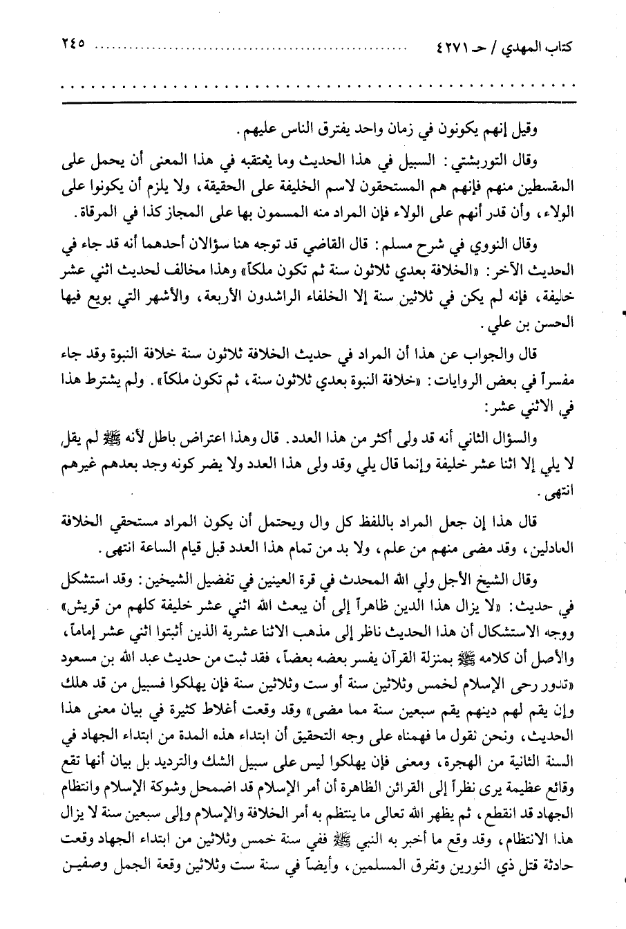 وَقَالَ الشَّيْخُ الْأَجَلُّ وَلِيُّ اللَّهِ الْمُحَدِّثُ فِي قُرَّةِ الْعَيْنَيْنِ فِي تَفْضِيلِ الشَّيْخَيْنِ وَقَدِ اسْتُشْكِلَ فِي حَدِيثِ لَا يَزَالُ هَذَا الدِّينُ ظَاهِرًا إِلَى أَنْ يَبْعَثَ اللَّهُ اثْنَيْ عَشَرَ خَلِيفَةً كُلَّهُمْ مِنْ قُرَيْشٍ وَوَجْهُ الِاسْتِشْكَالِ أَنَّ هَذَا الْحَدِيثَ نَاظِرٌ إِلَى مَذْهَبِ الِاثْنَا عَشْرِيَّةَ الَّذِينَ أَثْبَتُوا اثْنَيْ عَشَرَ إِمَامًا والأصل إن كلامه بِمَنْزِلَةِ الْقُرْآنِ يُفَسِّرُ بَعْضُهُ بَعْضًا فَقَدْ ثَبَتَ مِنْ حَدِيثِ عَبْدِ اللَّهِ بْنِ مَسْعُودٍ تَدُورُ رَحَى الْإِسْلَامِ لِخَمْسٍ وَثَلَاثِينَ سَنَةً أَوْ سِتٍّ وَثَلَاثِينَ سَنَةً فَإِنْ يَهْلِكُوا فَسَبِيلُ مَنْ قَدْ هَلَكَ وَإِنْ يَقُمْ لَهُمْ دِينُهُمْ يَقُمْ سَبْعِينَ سَنَةً مِمَّا مَضَى وَقَدْ وَقَعَتْ أَغْلَاطٌ كَثِيرَةٌ فِي بَيَانِ مَعْنَى هَذَا الْحَدِيثِ وَنَحْنُ نَقُولُ مَا فَهِمْنَاهُ عَلَى وَجْهِ التَّحْقِيقِ أَنَّ ابْتِدَاءَ هَذِهِ الْمُدَّةِ مِنِ ابْتِدَاءِ الْجِهَادِ فِي السَّنَةِ الثَّانِيَةِ مِنَ الْهِجْرَةِ وَمَعْنَى فَإِنْ يَهْلِكُوا لَيْسَ عَلَى سَبِيلِ الشَّكِّ وَالتَّرْدِيدِ بَلْ بَيَانُ أَنَّهَا تَقَعُ وَقَائِعٌ عَظِيمَةٌ يُرَى نَظَرًا إِلَى الْقَرَائِنِ الظَّاهِرَةِ أَنَّ أَمْرَ الْإِسْلَامِ قَدِ اضْمَحَلَّ وَشَوْكَةَ الْإِسْلَامِ وَانْتِظَامَ الْجِهَادِ قَدِ انْقَطَعَ ثُمَّ يُظْهِرُ اللَّهُ تَعَالَى مَا يَنْتَظِمُ بِهِ أَمْرُ الْخِلَافَةِ وَالْإِسْلَامِ وَإِلَى سَبْعِينَ سَنَةً لَا يَزَالُ هَذَا الِانْتِظَامُ وَقَدْ وَقَعَ مَا أَخْبَرَ بِهِ النَّبِيُّ فَفِي سَنَةِ خَمْسٍ وَثَلَاثِينَ مِنِ ابْتِدَاءِ الْجِهَادِ وَقَعَتْ حَادِثَةُ قَتَلَ ذِي النُّورَيْنِ وَتَفَرَّقَ الْمُسْلِمِينَ وَأَيْضًا فِي سَنَةِ سِتٍّ وَثَلَاثِينَ وَقْعَةُ الْجَمَلِ وصفين
