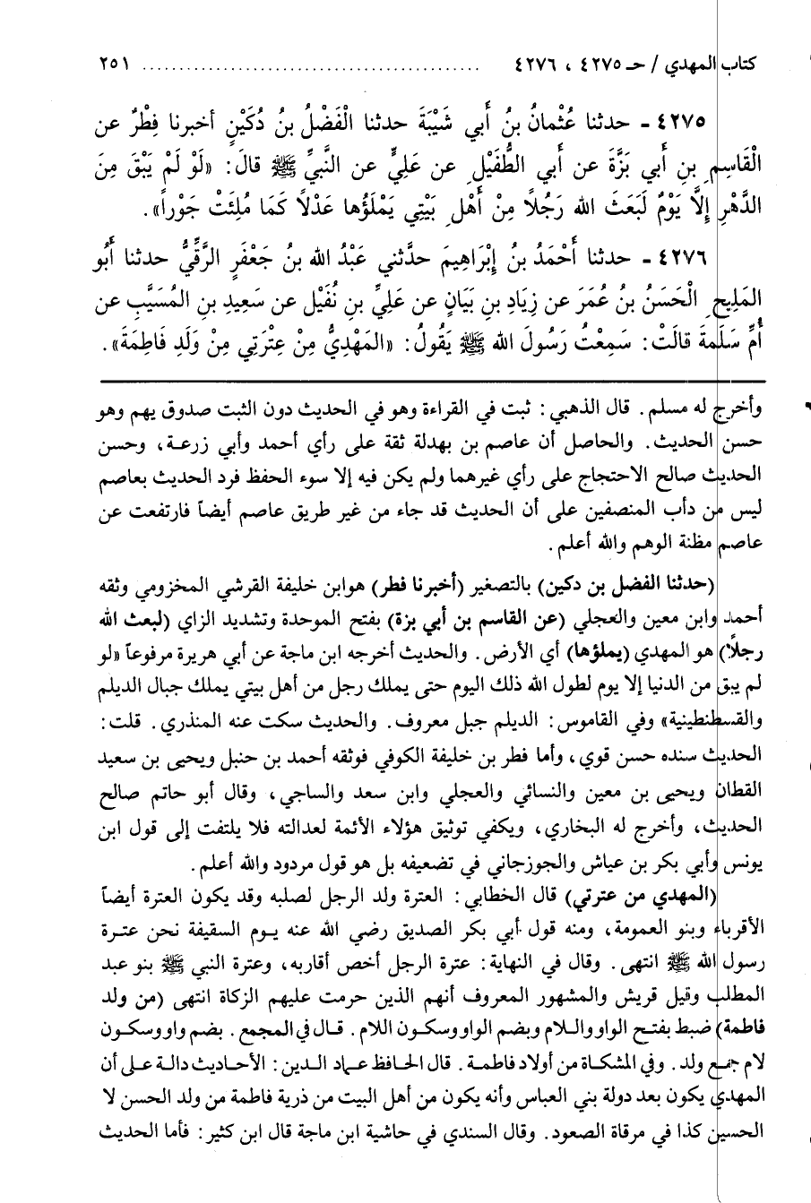 قَالَ الْحَافِظُ عِمَادُ الدِّينِ الْأَحَادِيثُ دَالَّةٌ عَلَى أَنَّ الْمَهْدِيَّ يَكُونُ بَعْدَ دَوْلَةِ بَنِي الْعَبَّاسِ وَأَنَّهُ يَكُونُ مِنْ أَهْلِ الْبَيْتِ مِنْ ذُرِّيَّةِ فَاطِمَةَ مِنْ وَلَدِ الْحَسَنِ لَا الْحُسَيْنِ كَذَا فِي مِرْقَاةِ الصُّعُودِ