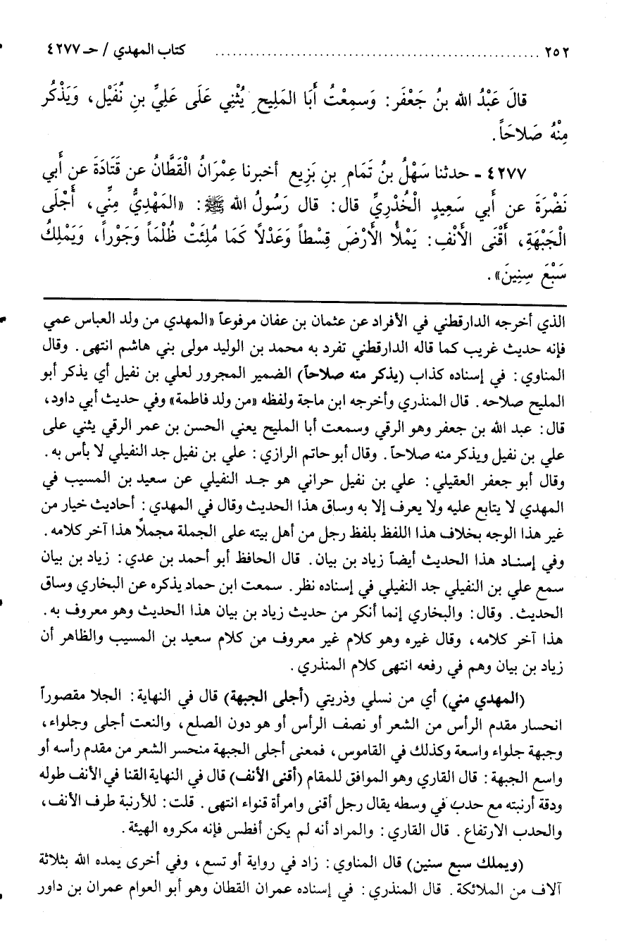 [4285] (الْمَهْدِيُّ مِنِّي) أَيْ مِنْ نَسْلِي وَذُرِّيَّتِي (أَجْلَى الْجَبْهَةِ) قَالَ فِي النِّهَايَةِ الْجَلَا مَقْصُورًا انْحِسَارُ مُقَدَّمِ الرَّأْسِ مِنَ الشَّعْرِ أَوْ نِصْفِ الرَّأْسِ أَوْ هُوَ دُونَ الصَّلَعِ وَالنَّعْتُ أَجْلَى وَجَلْوَاءُ وَجَبْهَةٌ جَلْوَاءُ وَاسِعَةٌ وَكَذَلِكَ فِي الْقَامُوسِ فَمَعْنَى أَجْلَى الْجَبْهَةِ مُنْحَسِرُ الشَّعْرِ مِنْ مُقَدَّمِ رَأْسِهِ أَوْ وَاسِعُ الْجَبْهَةِ قَالَ القارىء وَهُوَ الْمُوَافِقُ لِلْمَقَامِ (أَقْنَى الْأَنْفِ) قَالَ فِي النهاية القنافي الْأَنْفِ طُولُهُ وَدِقَّةُ أَرْنَبَتِهِ مَعَ حَدَبٍ فِي وَسَطِهِ يُقَالُ رَجُلٌ وَامْرَأَةٌ قَنْوَاءُ انْتَهَى