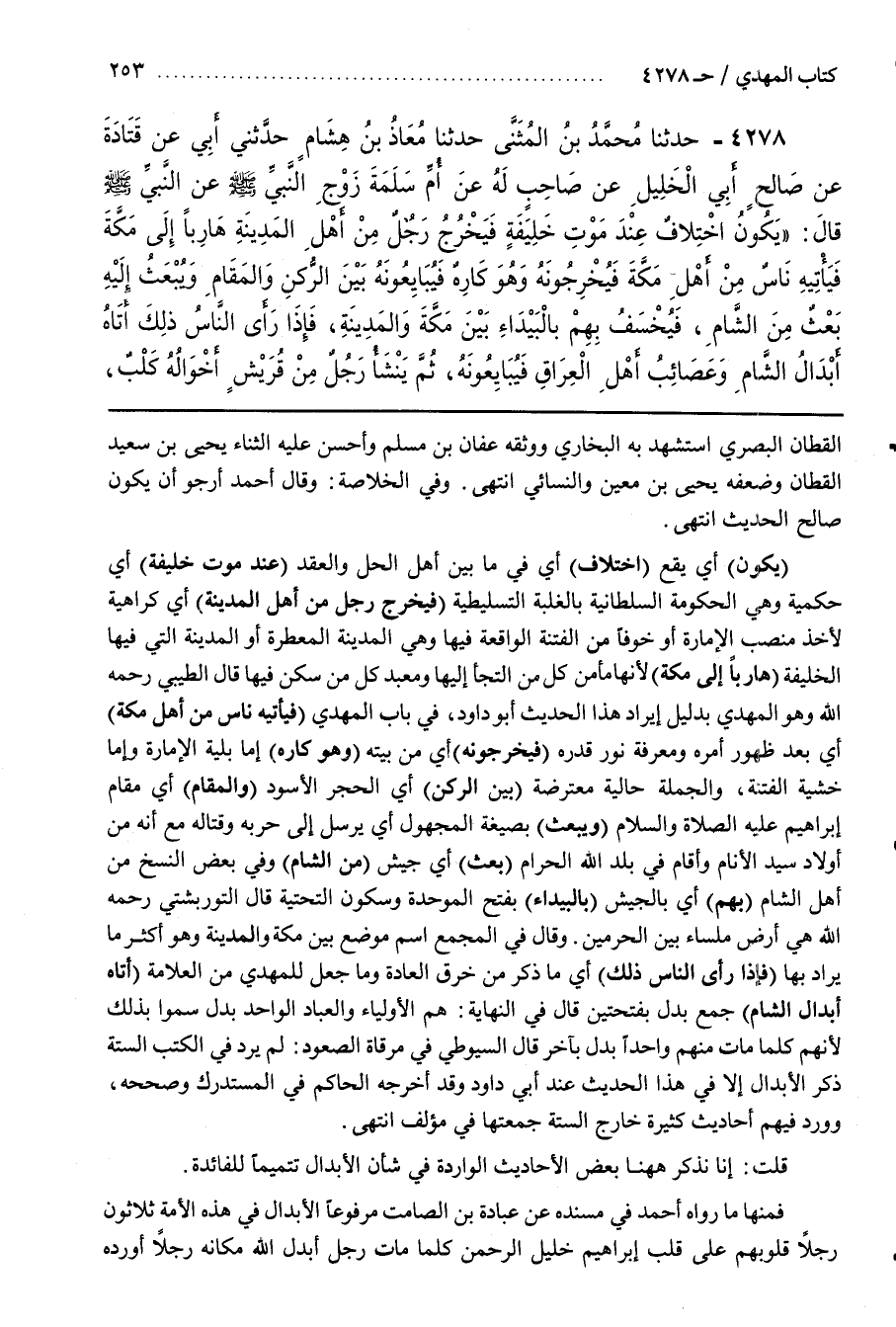 وَقَالَ فِي الْمَجْمَعِ اسْمُ مَوْضِعٍ بَيْنَ مَكَّةَ وَالْمَدِينَةِ وَهُوَ أَكْثَرُ مَا يُرَادُ بِهَا (فَإِذَا رَأَى النَّاسُ ذَلِكَ) أَيْ مَا ذُكِرَ مِنْ خَرْقِ الْعَادَةِ وَمَا جُعِلَ لِلْمَهْدِيِّ مِنَ الْعَلَامَةِ (أَتَاهُ أَبْدَالُ الشَّامِ) جَمْعُ بَدَلٍ بِفَتْحَتَيْنِ قَالَ فِي النِّهَايَةِ هُمُ الْأَوْلِيَاءُ وَالْعُبَّادُ الْوَاحِدُ بَدَلٌ سُمُّوا بِذَلِكَ لِأَنَّهُمْ كلما مات منهم واحدا بدل بِآخَرَ قَالَ السُّيُوطِيُّ فِي مِرْقَاةِ الصُّعُودِ لَمْ يَرِدْ فِي الْكُتُبِ السِّتَّةِ ذِكْرُ الْأَبْدَالِ إِلَّا فِي هَذَا الْحَدِيثِ عِنْدَ أَبِي دَاوُدَ وَقَدْ أَخْرَجَهُ الْحَاكِمُ فِي الْمُسْتَدْرَكِ وَصَحَّحَهُ وَوَرَدَ فِيهِمْ أَحَادِيثُ كَثِيرَةٌ خَارِجَ السِّتَّةِ جَمَعْتُهَا فِي مُؤَلَّفٍ انتهى