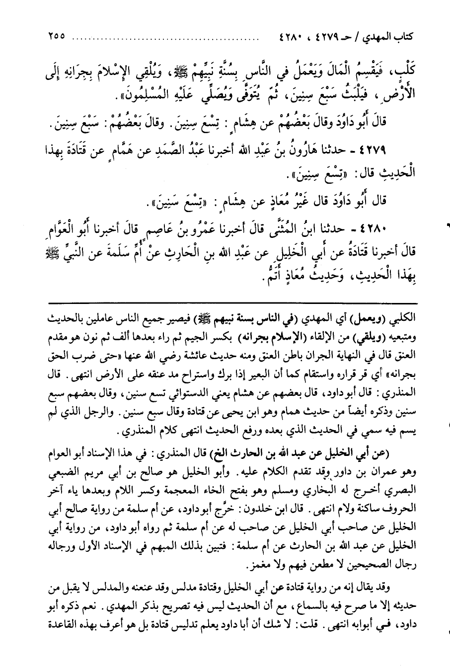 قَالَ الْمُنْذِرِيُّ قَالَ أَبُو دَاوُدَ قَالَ بَعْضُهُمْ عَنْ هِشَامٍ يَعْنِي الدَّسْتُوَائِيَّ تِسْعَ سِنِينَ وَقَالَ بَعْضُهُمْ سَبْعَ سِنِينَ وذكره أيضا من حديث همام وهو بن يَحْيَى عَنْ قَتَادَةَ وَقَالَ سَبْعَ سِنِينَ