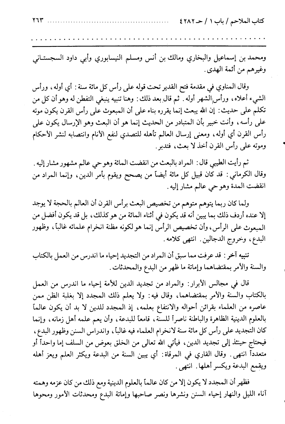 قَالَ فِي مَجَالِسِ الْأَبْرَارِ وَالْمُرَادُ مِنْ تَجْدِيدِ الدِّينِ لِلْأُمَّةِ إِحْيَاءُ مَا انْدَرَسَ مِنَ الْعَمَلِ بِالْكِتَابِ وَالسُّنَّةِ وَالْأَمْرَ بِمُقْتَضَاهُمَا وَقَالَ فِيهِ وَلَا يُعْلَمُ ذَلِكَ الْمُجَدِّدُ إِلَّا بِغَلَبَةِ الظَّنِّ مِمَّنْ عَاصَرَهُ مِنَ الْعُلَمَاءِ بِقَرَائِنِ أَحْوَالِهِ وَالِانْتِفَاعِ بِعِلْمِهِ إِذِ الْمُجَدِّدُ لِلدِّينِ لَا بُدَّ أَنْ يَكُونَ عَالِمًا بِالْعُلُومِ الدِّينِيَّةِ الظَّاهِرَةِ وَالْبَاطِنَةِ قَاصِرًا لِلسُّنَّةِ قَامِعًا لِلْبِدْعَةِ وَأَنْ يَعُمَّ عِلْمُهُ أَهْلَ زَمَانِهِ وَإِنَّمَا كَانَ التَّجْدِيدُ عَلَى رَأْسِ كُلِّ مِائَةِ سَنَةٍ لِانْخِرَامِ الْعُلَمَاءِ فِيهِ غَالِبًا وَانْدِرَاسِ السُّنَنِ وَظُهُورِ الْبِدَعِ فَيُحْتَاجُ حِينَئِذٍ إِلَى تَجْدِيدِ الدِّينِ فَيَأْتِي اللَّهُ تَعَالَى مِنَ الْخَلْقِ بِعِوَضٍ مِنَ السَّلَفِ إما واحدا أو متعددا انتهى