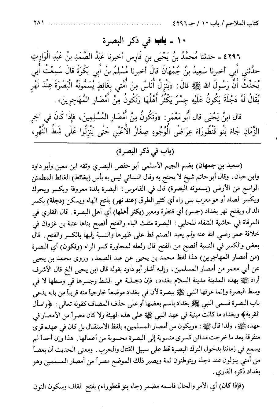 [4306] (سَعِيدُ بْنُ جُمْهَانَ) بِضَمِّ الْجِيمِ الْأَسْلَمِيُّ أَبُو حَفْصٍ الْبَصْرِيِّ وَثَّقَهُ بن معين وأبو داود وبن حِبَّانَ وَقَالَ أَبُو حَاتِمٍ شَيْخٌ لَا يُحْتَجُّ بِهِ وَقَالَ النَّسَائِيُّ لَيْسَ بِهِ بَأْسٌ (بِغَائِطٍ) الْغَائِطُ الْمُطَمْئِنُ الْوَاسِعُ مِنَ الْأَرْضِ (يُسَمُّونَهُ الْبَصْرَةَ) قَالَ فِي الْقَامُوسِ الْبَصْرَةُ بَلْدَةٌ مَعْرُوفَةٌ وَيُكْسَرُ وَيُحَرَّكُ وَيُكْسَرُ الصَّادُ أَوْ هُوَ مُعَرَّبُ بس راه أَيْ كَثِيرُ الطُّرُقِ (عِنْدَ نَهَرِ) بِفَتْحِ الْهَاءِ وَيُسَكَّنُ (دِجْلَةَ) بِكَسْرِ الدَّالِ وَيُفْتَحُ نَهَرُ بَغْدَادَ (جِسْرٌ) أَيْ قَنْطَرَةٌ وَمَعْبَرٌ (يَكْثُرُ أَهْلُهَا) أي أهل البصرة