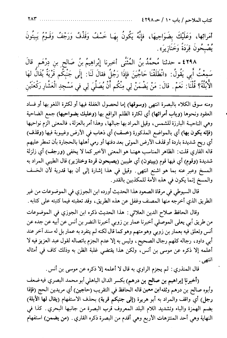 وَمِنْهُ سُوقُ الْكَلَّاءِ بِالْبَصْرَةِ انْتَهَى (وَسُوقَهَا) إِمَّا لِحُصُولِ الْغَفْلَةِ فِيهَا أَوْ لِكَثْرَةِ اللَّغْوِ بِهَا أَوْ فَسَادِ الْعُقُودِ وَنَحْوِهَا (وَبَابَ أُمَرَائِهَا) أَيْ لِكَثْرَةِ الظُّلْمِ الْوَاقِعِ بِهَا (وَعَلَيْكَ بِضَوَاحِيهَا) جَمْعُ الضَّاحِيَةِ وَهِيَ النَّاحِيَةُ الْبَارِزَةُ لِلشَّمْسِ وَقِيلَ الْمُرَادُ بِهَا جِبَالُهَا وَهَذَا أَمْرٌ بِالْعُزْلَةِ فَالْمَعْنَى الْزَمْ نَوَاحِيهَا (فَإِنَّهُ يَكُونُ بِهَا) أَيْ بِالْمَوَاضِعِ الْمَذْكُورَةِ (خَسْفٌ) أَيْ ذَهَابٌ فِي الْأَرْضِ وَغَيْبُوبَةٌ فِيهَا (وَقَذْفٌ) أَيْ رِيحٌ شَدِيدَةٌ بَارِدَةٌ أَوْ قَذْفُ الْأَرْضِ الْمَوْتَى بَعْدَ دَفْنِهَا أَوْ رَمْيُ أَهْلِهَا بالحجارة بأن تمطر عليهم قاله القارىء قلت الظاهر المناسب ها هنا هُوَ الْمَعْنَى الْأَخِيرُ كَمَا لَا يَخْفَى (وَرَجْفٌ) أَيْ زَلْزَلَةٌ شَدِيدَةٌ (وَقَوْمٌ) أَيْ فِيهَا قَوْمٌ (يَبِيتُونَ) أَيْ طَيِّبِينَ (يُصْبِحُونَ قِرَدَةً وَخَنَازِيرَ) قَالَ الطِّيبِيُّ الْمُرَادُ بِهِ الْمَسْخُ وَعَبَّرَ عَنْهُ بِمَا هُوَ أَشْنَعُ انْتَهَى