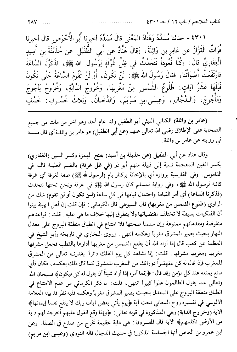 قُلْتُ إِنَّا نُشَاهِدُ كُلَّ يَوْمٍ الْفَلَكَ دَائِرًا بِقُدْرَتِهِ تَعَالَى مِنَ الْمَشْرِقِ لِلْمَغْرِبِ فَإِذَا قَالَ لَهُ كُنْ مُقَهْقِرًا دَوَرَانَكَ مِنَ الْمَغْرِبِ لِلْمَشْرِقِ كَمَا قَالَ ذَلِكَ بِعَكْسِهِ فَكَانَ فَأَيُّ مَانِعٍ يَمْنَعُهُ عِنْدَ كُلِّ مُؤْمِنٍ وَقَدْ قَالَ إِنَّمَا أَمْرُهُ إِذَا أَرَادَ شَيْئًا أَنْ يَقُولَ له كن فيكون فَسُبْحَانَ اللَّهِ تَعَالَى عَمَّا يَقُولُ الظَّالِمُونَ عُلُوًّا كَبِيرًا انْتَهَى قُلْتُ مَا ذَكَرَ الْكِرْمَانِيُّ مِنْ عَدَمِ الِامْتِنَاعِ فِي انْطِبَاقِ مِنْطَقَةُ الْبُرُوجِ عَلَى الْمُعَدَّلِ بِحَيْثُ يَصِيرُ الْمَشْرِقُ مَغْرِبًا وَعَكْسُهُ فَفِيهِ نَظَرٌ قَدْ بَيَّنَهُ الْعَلَّامَةُ الْأَلُوسِيُّ فِي تَفْسِيرِهِ رُوحُ الْمَعَانِي تَحْتَ آيَةِ يَوْمَ يَأْتِي بَعْضُ آيات ربك لا ينفع نفسا إيمانها الْآيَةَ وَخُرُوجُ الدَّابَّةِ وَهِيَ الْمَذْكُورَةُ فِي قَوْلِهِ تَعَالَى وَإِذَا وَقَعَ الْقَوْلُ عَلَيْهِمْ أَخْرَجْنَا لَهُمْ دابة من الأرض تكلمهم الْآيَةَ قَالَ الْمُفَسِّرُونَ هِيَ دَابَّةٌ عَظِيمَةٌ تَخْرُجُ من صدع في الصفا