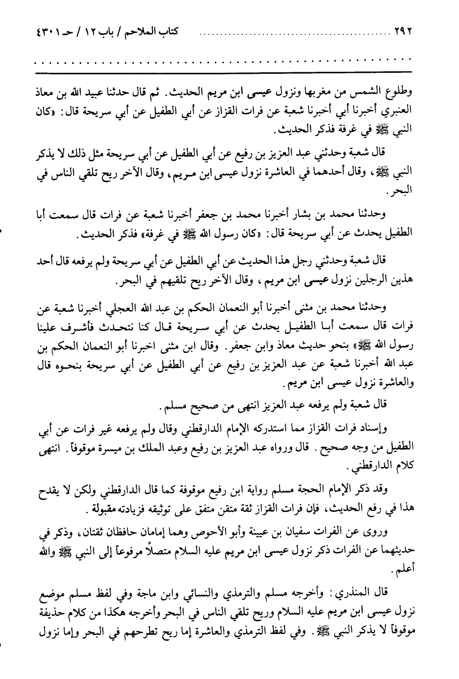 وَرَوَى عَنِ الْفُرَاتِ سُفْيَانُ بْنُ عُيَيْنَةَ وأبو الأحوص وهما إمامان حافظان ثقتان وذكر فِي حَدِيثِهِمَا عَنِ الْفُرَاتِ ذِكْرَ نُزُولِ عِيسَى بن مَرْيَمَ عَلَيْهِ السَّلَامُ مُتَّصِلًا مَرْفُوعًا إِلَى النَّبِيِّ وَاللَّهُ أَعْلَمُ