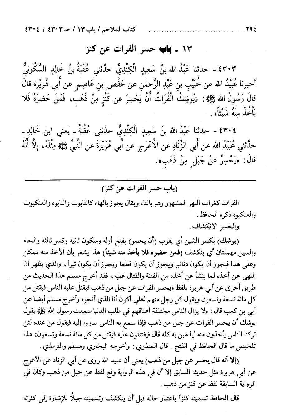 [4313] يُوشِكُ) بِكَسْرِ الشِّينِ أَيْ يَقْرَبُ (أَنْ يَحْسِرَ) بِفَتْحِ أَوَّلِهِ وَسُكُونِ ثَانِيهِ وَكَسْرِ ثَالِثِهِ وَالْحَاءُ وَالسِّينُ مُهْمَلَتَانِ أَيْ يَنْكَشِفُ (فَمَنْ حَضَرَهُ فَلَا يَأْخُذْ مِنْهُ شَيْئًا) هَذَا يُشْعِرُ بِأَنَّ الْأَخْذَ منه ممكن وعلى هذا فيجوز أَنْ يَكُونَ دَنَانِيرَ وَيَجُوزُ أَنْ يَكُونَ قِطَعًا وَيَجُوزُ أَنْ يَكُونَ تِبْرًا وَالَّذِي يَظْهَرُ أَنَّ النَّهْيَ عَنْ أَخْذِهِ لِمَا يَنْشَأُ عَنْ أَخْذِهِ مِنَ الْفِتْنَةِ وَالْقِتَالِ عَلَيْهِ فَقَدْ أَخْرَجَ مُسْلِمٌ هَذَا الْحَدِيثَ مِنْ طَرِيقٍ أُخْرَى عَنْ أَبِي هُرَيْرَةَ بِلَفْظِ يَحْسِرَ الْفُرَاتُ عَنْ جَبَلٍ مِنْ ذهب فيقتل عَلَيْهِ النَّاسُ فَيُقْتَلُ مِنْ كُلِّ مِائَةٍ تِسْعَةٌ وتسعين وَيَقُولُ كُلُّ رَجُلٍ مِنْهُمْ لَعَلِّي أَكُونُ أَنَا الَّذِي أَنْجُو وَأَخْرَجَ مُسْلِمٌ أَيْضًا عَنْ أُبَيِّ بْنِ كَعْبٍ قَالَ لَا يَزَالُ النَّاسُ مُخْتَلِفَةً أَعْنَاقُهُمْ فِي طَلَبِ الدُّنْيَا سَمِعْتُ رَسُولَ اللَّهِ صَلَّى اللَّهُ عَلَيْهِ وَسَلَّمَ يَقُولُ يُوشِكُ أَنْ يَحْسِرَ الْفُرَاتُ عَنْ جَبَلٍ مِنْ ذَهَبٍ فَإِذَا سَمِعَ بِهِ النَّاسُ سَارُوا إِلَيْهِ فَيَقُولُ مَنْ عِنْدَهُ لَئِنْ تَرَكْنَا النَّاسَ يَأْخُذُونَ مِنْهُ لَيُذْهَبَنَّ بِهِ كُلِّهُ قَالَ فَيَقْتَتِلُونَ عَلَيْهِ فَيُقْتَلُ مِنْ كُلِّ مِائَةٍ تِسْعَةٌ وَتِسْعُونَ هَذَا تَلْخِيصُ مَا قَالَ الْحَافِظُ فِي الْفَتْحِ