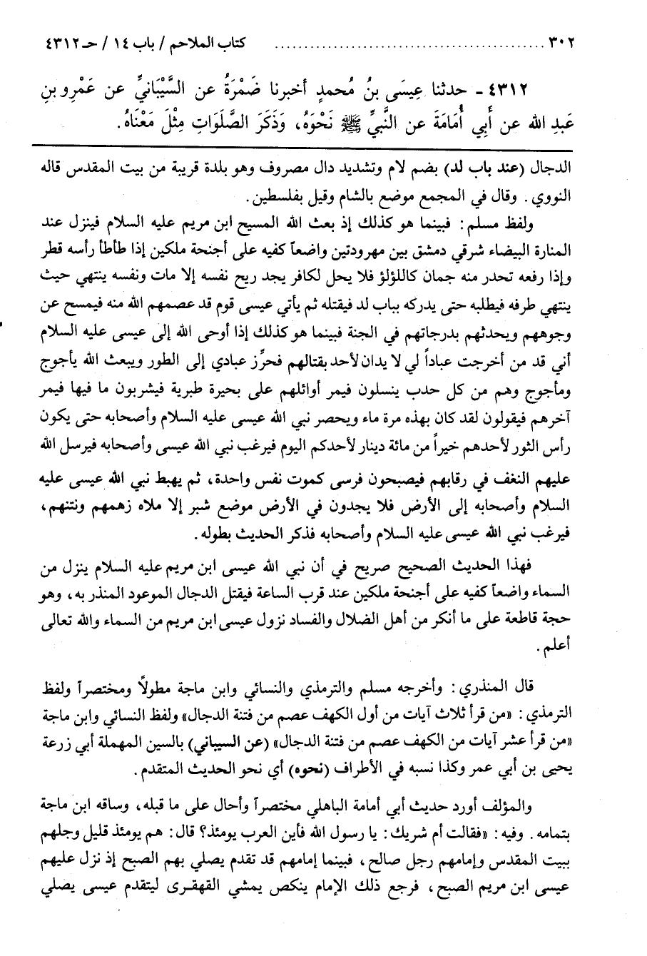 وَلَفْظُ مُسْلِمٍ فَبَيْنَمَا هُوَ كذلك إذ بعث الله المسيح بن مَرْيَمَ عَلَيْهِ السَّلَامُ فَيَنْزِلُ عِنْدَ الْمَنَارَةِ الْبَيْضَاءِ شَرْقِيَّ دِمَشْقَ بَيْنَ مَهْرُودَتَيْنِ وَاضِعًا كَفَّيْهِ عَلَى أَجْنِحَةِ مَلَكَيْنِ إِذَا طَأْطَأَ رَأْسَهُ قَطَرَ وَاذَا رَفَعَهُ تَحَدَّرَ مِنْهُ جُمَّانٌ كَاللُّؤْلُؤِ فَلَا يَحِلُّ لِكَافِرٍ يَجِدُ رِيحَ نَفَسِهِ إِلَّا مَاتَ وَنَفَسُهُ يَنْتَهِي حَيْثُ يَنْتَهِي طَرَفُهُ فَيَطْلُبُهُ حَتَّى يُدْرِكَهُ بِبَابِ لُدٍّ فَيَقْتُلُهُ ثُمَّ يَأْتِيَ عِيسَى قَوْمٌ قَدْ عَصَمَهُمُ اللَّهُ مِنْهُ فَيَمْسَحُ عَنْ وُجُوهِهِمْ وَيُحَدِّثَهُمْ بِدَرَجَاتِهِمْ فِي الْجَنَّةِ فَبَيْنَمَا هُوَ كَذَلِكَ إِذْ أَوْحَى اللَّهُ إِلَى عِيسَى عَلَيْهِ السَّلَامُ أَنِّي قَدْ أَخْرَجْتُ عِبَادًا لِي لَا يَدَانِ لِأَحَدٍ بِقِتَالِهِمْ فَحَرِّزْ عِبَادِي إِلَى الطُّورِ وَيَبْعَثُ اللَّهُ يَأْجُوجَ وَمَأْجُوجَ وَهُمْ مِنْ كُلِّ حَدَبٍ يَنْسِلُونَ فَيَمُرُّ أَوَائِلُهُمْ عَلَى بُحَيْرَةِ طَبَرِيَّةَ فَيَشْرَبُونَ مَا فِيهَا فَيَمُرُّ آخِرُهُمْ فَيَقُولُونَ لَقَدْ كَانَ بِهَذِهِ مَرَّةً مَاءٌ وَيُحْصَرُ نَبِيُّ اللَّهِ عِيسَى عَلَيْهِ السَّلَامُ وَأَصْحَابُهُ حَتَّى يَكُونَ رَأْسُ الثَّوْرِ لِأَحَدِهِمْ خَيْرًا مِنْ مِائَةِ دِينَارٍ لِأَحَدِكُمُ الْيَوْمَ فَيَرْغَبُ نَبِيُّ اللَّهِ عِيسَى وَأَصْحَابُهُ فَيُرْسِلُ اللَّهُ عَلَيْهِمُ النَّغَفَ فِي رِقَابِهِمْ فَيُصْبِحُونَ فَرْسَى كَمَوْتِ نَفْسٍ وَاحِدَةٍ ثُمَّ يَهْبِطُ نَبِيُّ اللَّهِ عِيسَى عَلَيْهِ السَّلَامُ وَأَصْحَابُهُ إِلَى الْأَرْضِ فَلَا يَجِدُونَ فِي الْأَرْضِ مَوْضِعَ شِبْرٍ إِلَّا مَلَاهُ زَهَمُهُمْ وَنَتَنُهُمْ فَيَرْغَبُ نَبِيُّ اللَّهِ عِيسَى عَلَيْهِ السَّلَامُ وَأَصْحَابُهُ فَذَكَرَ الْحَدِيثَ بِطُولِهِ