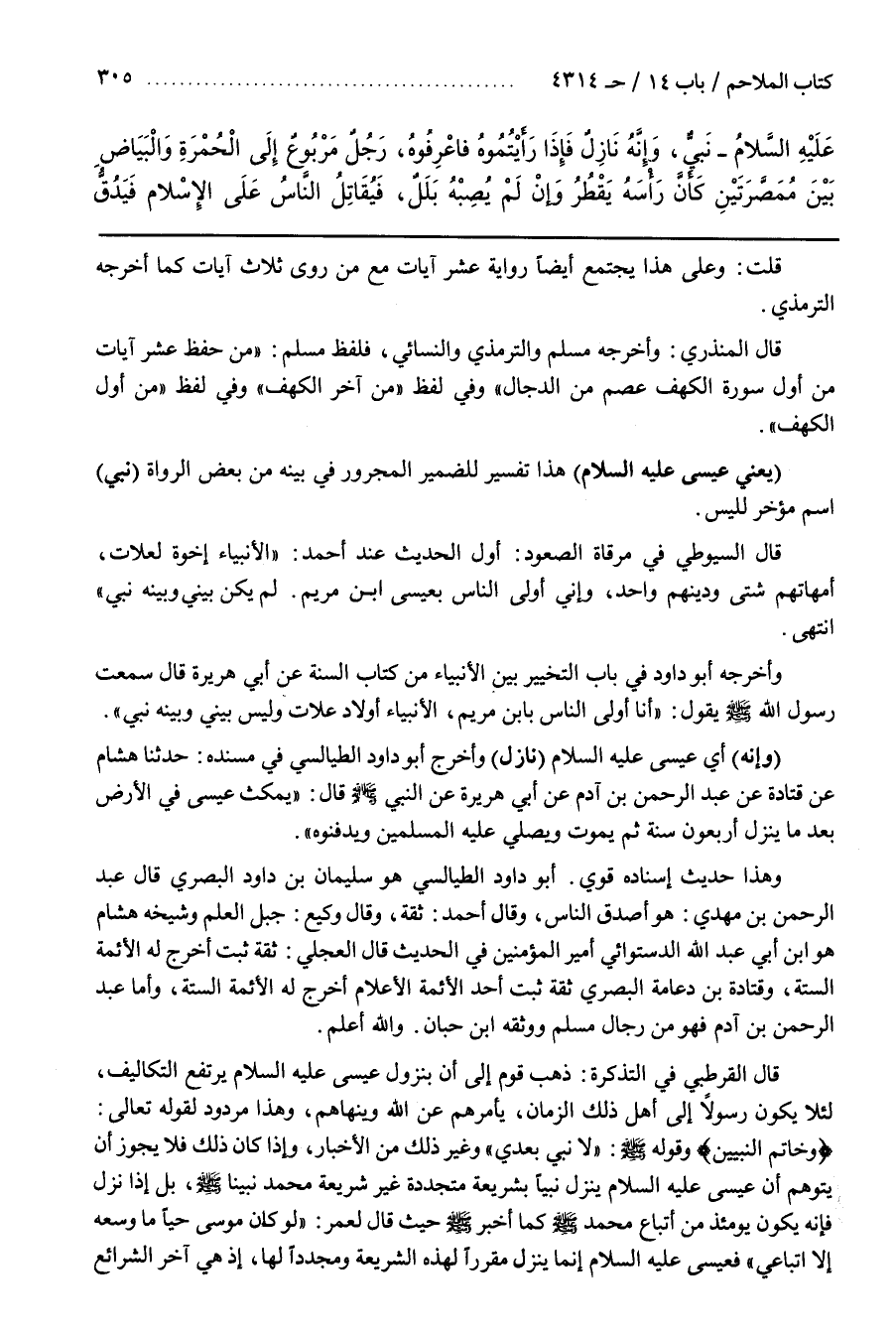 قَالَ الْقُرْطُبِيُّ فِي التَّذْكِرَةِ ذَهَبَ قَوْمٌ إِلَى أَنَّ بِنُزُولِ عِيسَى عَلَيْهِ السلام يرتفع التكاليف لِئَلَّا يَكُونَ رَسُولًا إِلَى أَهْلِ ذَلِكَ الزَّمَانِ يَأْمُرُهُمْ عَنِ اللَّهِ وَيَنْهَاهُمْ وَهَذَا مَرْدُودٌ لِقَوْلِهِ تعالى وخاتم النبيين وقوله لَا نَبِيَّ مِنْ بَعْدِي وَغَيْرِ ذَلِكَ مِنَ الْأَخْبَارِ وَإِذَا كَانَ ذَلِكَ فَلَا يَجُوزُ أَنْ يُتَوَهَّمَ أَنَّ عِيسَى عَلَيْهِ السَّلَامُ يَنْزِلُ نَبِيًّا بشريعة متجددة غير شريعة محمد نبينا بَلْ إِذَا نَزَلَ فَإِنَّهُ يَكُونُ يَوْمَئِذٍ مِنْ أتباع محمد كما أخبر حَيْثُ قَالَ لِعُمَرَ لَوْ كَانَ مُوسَى حَيًّا مَا وَسِعَهُ إِلَّا اتِّبَاعِي فَعِيسَى عَلَيْهِ السَّلَامُ إِنَّمَا يَنْزِلُ مُقَرِّرًا لِهَذِهِ الشَّرِيعَةِ وَمُجَدِّدًا لَهَا إذ هي آخر الشرائع