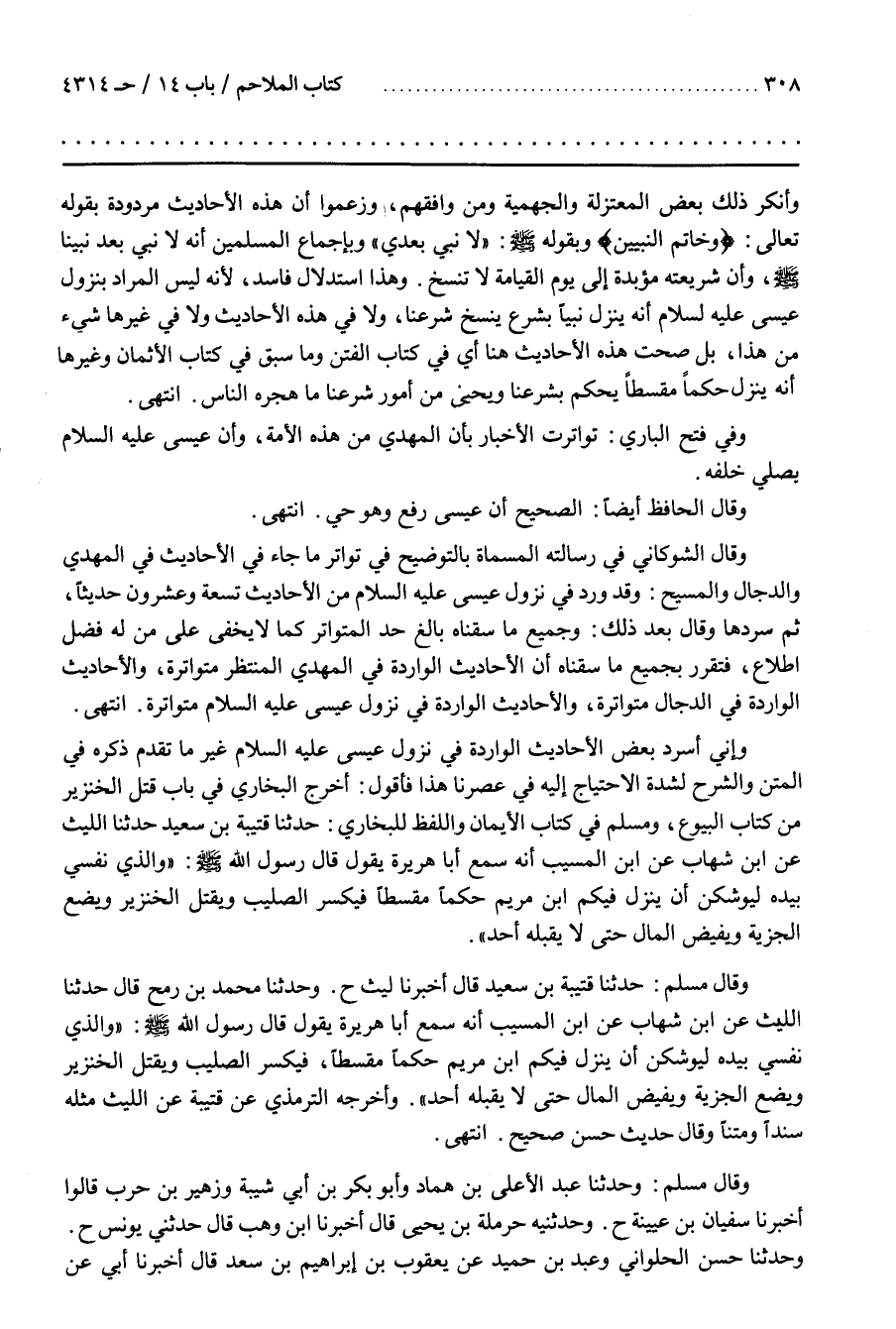 وَإِنِّي أَسْرُدُ بَعْضَ الْأَحَادِيثِ الْوَارِدَةِ فِي نُزُولِ عِيسَى عَلَيْهِ السَّلَامُ غَيْرَ مَا تَقَدَّمَ ذِكْرُهُ فِي الْمَتْنِ وَالشَّرْحِ لِشِدَّةِ الِاحْتِيَاجِ إِلَيْهِ فِي عَصْرِنَا هَذَا فَأَقُولُ أَخْرَجَ الْبُخَارِيُّ فِي بَابِ قَتْلِ الْخِنْزِيرِ مِنْ كِتَابِ الْبُيُوعِ وَمُسْلِمٌ فِي كِتَابِ الْإِيمَانِ وَاللَّفْظُ لِلْبُخَارِيِّ حَدَّثَنَا قُتَيْبَةُ بْنُ سَعِيدٍ حَدَّثَنَا اللَّيْثُ عَنْ بن شهاب عن بن الْمُسَيَّبِ أَنَّهُ سَمِعَ أَبَا هُرَيْرَةَ يَقُولُ قَالَ رسول الله وَالَّذِي نَفْسِي بِيَدِهِ لَيُوشِكَنَّ أَنْ يَنْزِلَ فِيكُمُ بن مَرْيَمَ حَكَمًا مُقْسِطًا فَيَكْسِرُ الصَّلِيبَ وَيَقْتُلُ الْخِنْزِيرَ ويضع الجزية ويفيض المال حتى لا يقبله أَحَدٌ