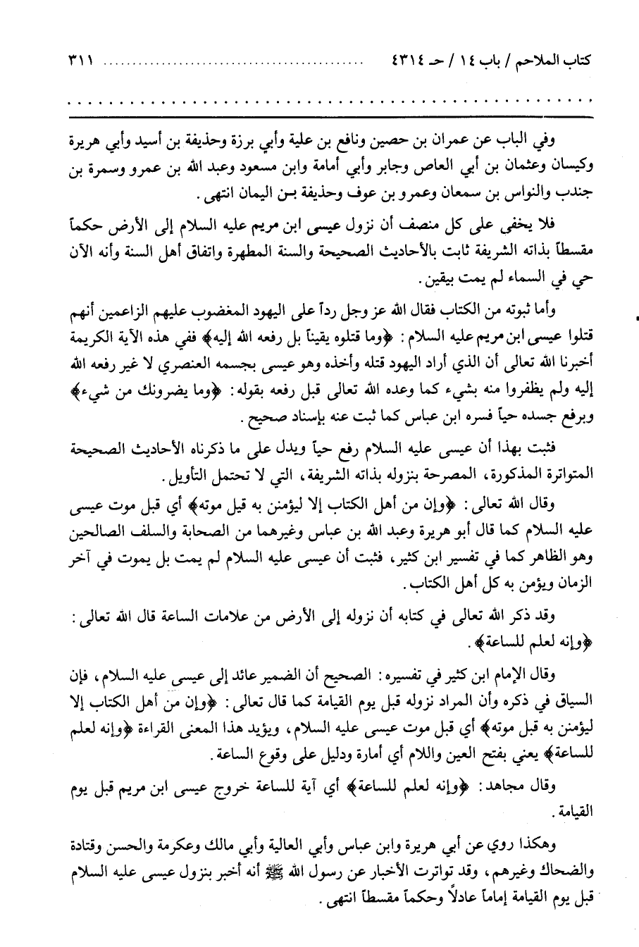 وَقَالَ اللَّهُ تَعَالَى وَإِنْ مِنْ أَهْلِ الْكِتَابِ إِلَّا لَيُؤْمِنَنَّ بِهِ قَبْلَ مَوْتِهِ أي قبل موت عيسى بن مَرْيَمَ عَلَيْهِ السَّلَامُ كَمَا قَالَ أَبُو هُرَيْرَةَ وَعَبْدُ اللَّهِ بْنُ عَبَّاسٍ وَغَيْرُهُمَا مِنَ الصَّحَابَةِ وَالسَّلَفِ الصَّالِحِينَ وَهُوَ الظَّاهِرُ كَمَا فِي تَفْسِيرِ بن كَثِيرٍ فَثَبَتَ أَنَّ عِيسَى عَلَيْهِ السَّلَامُ لَمْ يَمُتْ بَلْ يَمُوتُ فِي آخِرِ الزَّمَانِ وَيُؤْمِنُ بِهِ كُلُّ أَهْلِ الْكِتَابِ