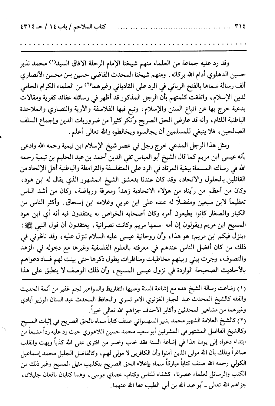 وَأَكْثَرُ النَّاسِ مِنَ الْكِبَارِ وَالصِّغَارِ كَانُوا يُطِيعُونَ أَمْرَهُ وَكَانَ أَصْحَابُهُ الْخَوَاصُّ بِهِ يَعْتَقِدُونَ فيه أنه أي بن هود المسيح بن مَرْيَمَ وَيَقُولُونَ إِنَّ أُمَّهُ اسْمُهَا مَرْيَمَ وَكَانَتْ نصرانية ويعتقدون أن قول النبي ينزل فيكم بن مَرْيَمَ هُوَ هَذَا وَأَنَّ رُوحَانِيَّةَ عِيسَى عَلَيْهِ السَّلَامُ تَنْزِلُ عَلَيْهِ وَقَدْ نَاظَرَنِي فِي ذَلِكَ مَنْ كَانَ أَفْضَلُ النَّاسِ عِنْدَهُمْ فِي مَعْرِفَتِهِ بِالْعُلُومِ الْفَلْسَفِيَّةِ وَغَيْرِهَا مَعَ دُخُولِهِ فِي الزُّهْدِ وَالتَّصَوُّفِ وَجَرَتْ بَيْنِي وَبَيْنَهُمْ مُخَاطَبَاتٌ وَمُنَاظَرَاتٌ يَطُولُ ذِكْرُهَا حَتَّى بَيَّنْتُ لَهُمْ فَسَادَ دَعْوَاهُمْ بِالْأَحَادِيثِ الصَّحِيحَةِ الْوَارِدَةِ فِي نُزُولِ عِيسَى الْمَسِيحِ وَأَنَّ ذَلِكَ الْوَصْفَ لَا يَنْطَبِقُ عَلَى هَذَا