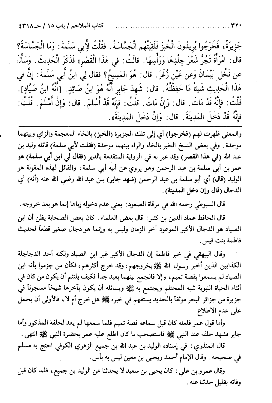 وَقَالَ الْبَيْهَقِيُّ فِي خبر فاطمة أن الدجال الأكبر غير بن الصَّيَّادِ وَلَكِنَّهُ أَحَدُ الدَّجَاجِلَةِ الْكَذَّابِينَ الَّذِينَ أَخْبَرَ رَسُولُ اللَّهِ صَلَّى اللَّهُ عَلَيْهِ وَسَلَّمَ بِخُرُوجِهِمْ وَقَدْ خَرَجَ أَكْثَرُهُمْ فَكَأَنَّ مَنْ جَزَمُوا بِأَنَّهُ بن الصَّيَّادِ لَمْ يَسْمَعُوا بِقِصَّةِ تَمِيمٍ وَإِلَّا فَالْجَمْعُ بَيْنَهُمَا بَعِيدٌ جِدًّا فَكَيْفَ يَلْتَئِمُ أَنْ يَكُونَ مَنْ كَانَ فِي أَثْنَاءِ الْحَيَاةِ النَّبَوِيَّةِ شِبْهَ الْمُحْتَلِمِ وَيَجْتَمِعُ بِهِ صَلَّى اللَّهُ عَلَيْهِ وَسَلَّمَ وَيُسَائِلُهُ أَنْ يَكُونَ بِآخِرِهَا شَيْخًا مَسْجُونًا فِي جَزِيرَةٍ مِنْ جَزَائِرِ الْبَحْرِ مُوثَقًا بِالْحَدِيدِ يَسْتَفْهِمُ فِي خَبَرِهِ صَلَّى اللَّهُ عَلَيْهِ وَسَلَّمَ هَلْ خَرَجَ أَمْ لَا فَالْأَوْلَى أَنْ يُحْمَلَ عَلَى عَدَمِ الِاطِّلَاعِ