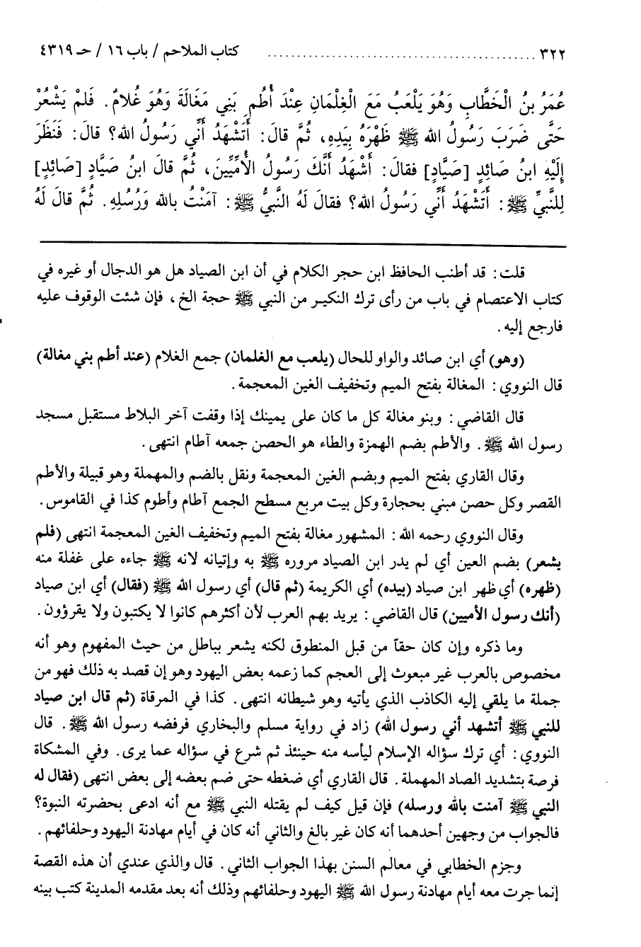 قلت قد أطنب الحافظ بن حجر الكلام في أن بن الصَّيَّادِ هَلْ هُوَ الدَّجَّالُ أَوْ غَيْرُهُ فِي كِتَابِ الِاعْتِصَامِ فِي بَابِ مَنْ رَأَى تَرْكَ النَّكِيرِ مِنَ النَّبِيِّ صَلَّى اللَّهُ عَلَيْهِ وَسَلَّمَ حُجَّةٌ إِلَخْ فَإِنْ شِئْتَ الْوُقُوفَ عَلَيْهِ فَارْجِعْ إليه