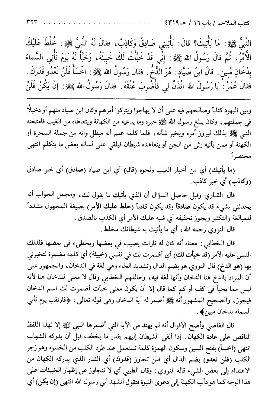 قَالَ الْخَطَّابِيُّ مَعْنَاهُ أَنَّهُ كَانَ لَهُ تَارَاتٍ يُصِيبُ فِي بعضها ويخطىء فِي بَعْضِهَا فَلِذَلِكَ الْتَبَسَ عَلَيْهِ الْأَمْرُ (قَدْ خَبَّأْتُ لَكَ) أَيْ أَضْمَرْتُ لَكَ فِي نَفْسِي (خَبِيئَةً) أَيْ كَلِمَةً مُضْمَرَةً لِتُخْبِرَنِي بِهَا (هُوَ الدُّخُّ) قَالَ النَّوَوِيُّ هُوَ بِضَمِّ الدَّالِ وَتَشْدِيدِ الْخَاءِ وَهِيَ لُغَةٌ فِي الدُّخَانِ وَالْجُمْهُورُ عَلَى أَنَّ الْمُرَادَ بِالدُّخِّ هُنَا الدُّخَانُ وَأَنَّهَا لُغَةٌ فِيهِ وَخَالَفَهُمِ الْخَطَّابِيُّ وَقَالَ لَا مَعْنَى لِلدُّخَانِ هُنَا لِأَنَّهُ لَيْسَ مِمَّا يُخَبَّأُ فِي كَفٍّ أَوْ كُمٍّ كَمَا قَالَ إِلَّا أَنْ يَكُونَ مَعْنَى خَبَّأْتُ أَضْمَرْتُ لَكَ اسْمَ الدُّخَانِ فَيَجُوزُ وَالصَّحِيحُ الْمَشْهُورُ أَنَّهُ صَلَّى اللَّهُ عَلَيْهِ وَسَلَّمَ أَضْمَرَ لَهُ آيَةَ الدُّخَانِ وَهِيَ قَوْلُهُ تَعَالَى فارتقب يوم تأتي السماء بدخان مبين