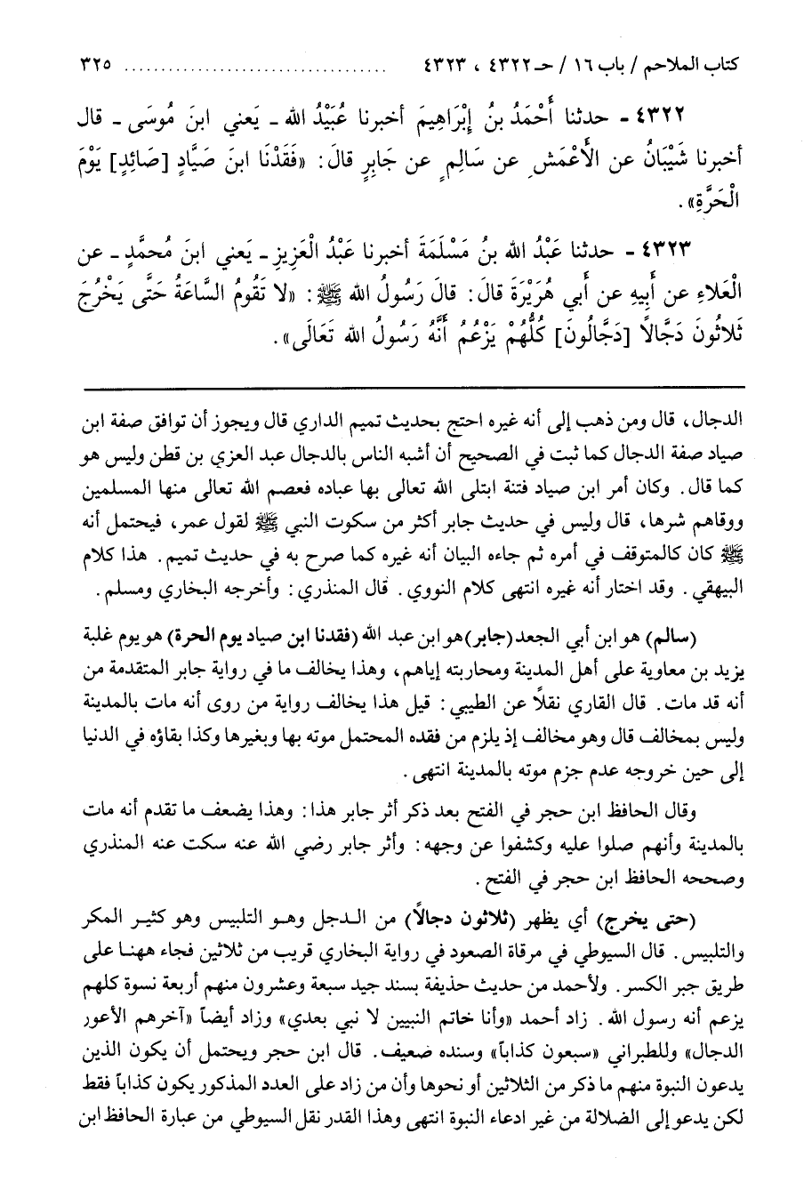 الدَّجَّالُ قَالَ وَمَنْ ذَهَبَ إِلَى أَنَّهُ غَيْرُهُ احْتَجَّ بِحَدِيثِ تَمِيمٍ الدَّارِيِّ قَالَ وَيَجُوزُ أَنْ توافق صفة بن صَيَّادٍ صِفَةَ الدَّجَّالِ كَمَا ثَبَتَ فِي الصَّحِيحِ أَنَّ أَشْبَهَ النَّاسِ بِالدَّجَّالِ عَبْدُ الْعُزَّى بْنُ قَطَنٍ وَلَيْسَ هُوَ كَمَا قَالَ