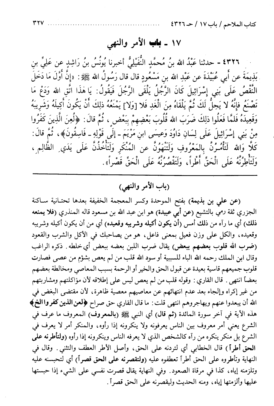 قال القارئ وَقَوْلُهُ قَلْبَ مَنْ لَمْ يَعْصِ لَيْسَ عَلَى إِطْلَاقِهِ لِأَنَّ مُؤَاكَلَتَهُمْ وَمُشَارَبَتَهُمْ مِنْ غَيْرِ إِكْرَاهٍ وَإِلْجَاءٍ بَعْدَ عَدَمِ انْتِهَائِهِمْ عَنْ مَعَاصِيهِمْ مَعْصِيَةٌ ظَاهِرَةٌ لِأَنَّ مُقْتَضَى الْبُغْضِ فِي اللَّهِ أَنْ يَبْعُدُوا عَنْهُمْ وَيُهَاجِرُوهُمُ انْتَهَى قُلْتُ مَا قَالَ القارىء حَقٌّ صُرَاحٌ (لُعِنَ الَّذِينَ كَفَرُوا إِلَخْ) هَذِهِ الْآيَةُ فِي آخِرِ سُورَةِ الْمَائِدَةِ (ثُمَّ قَالَ) أي النبي (بِالْمَعْرُوفِ) الْمَعْرُوفُ مَا عُرِفَ فِي الشَّرْعِ يَعْنِي أَمْرَ مَعْرُوفٍ بَيْنَ النَّاسِ يَعْرِفُونَهُ وَلَا يُنْكِرُونَهُ إِذَا رَأَوْهُ وَالْمُنْكَرُ أَمْرٌ لَا يُعْرَفُ فِي الشَّرْعِ بَلْ مُنْكَرٌ يُنْكِرُهُ مَنْ رَآهُ كَالشَّخْصِ الَّذِي لَا يَعْرِفُهُ النَّاسُ وَيُنْكِرُونَهُ إِذَا رَأَوْهُ (وَلَتَأْطُرُنَّهُ عَلَى الْحَقِّ أَطْرًا) قَالَ الْخَطَّابِيُّ أَيْ لَتَرُدُّنَّهُ عَلَى الْحَقِّ وَأَصْلُ الْأَطْرِ الْعَطْفُ وَالتَّثَنِّي