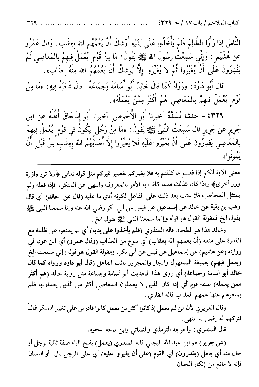 [4339] (عن جرير) هو بن عَبْدِ اللَّهِ الْبَجَلِيُّ قَالَهُ الْمُنْذِرِيُّ (يَعْمَلُ) بِفَتْحِ الْيَاءِ صِفَةٌ ثَانِيَةٌ لِرَجُلٍ أَوْ حَالٌ مِنْهُ أَيْ يَفْعَلُ (يَقْدِرُونَ) أَيِ الْقَوْمُ (عَلَى أَنْ يُغَيِّرُوا عَلَيْهِ) أَيْ عَلَى الرَّجُلِ بِالْيَدِ أَوِ اللِّسَانِ فَإِنَّهُ لَا مَانِعَ مِنْ إِنْكَارِ الْجَنَانِ
