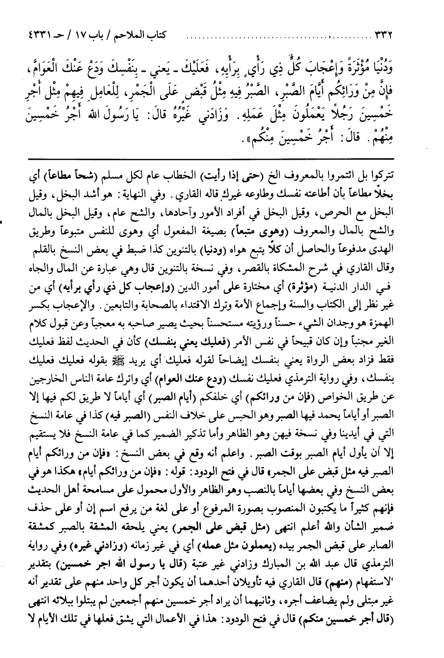وَاعْلَمْ أَنَّهُ وَقَعَ فِي بَعْضِ النُّسَخِ فَإِنَّ مِنْ وَرَائِكُمْ أَيَّامَ الصَّبْرُ فِيهِ مِثْلُ قَبْضٍ عَلَى الْجَمْرِ قَالَ فِي فَتْحِ الْوَدُودِ قَوْلُهُ فَإِنَّ مِنْ وَرَائِكُمْ أَيَّامَ هَكَذَا هُوَ فِي بَعْضِ النُّسَخِ وَفِي بَعْضِهَا أَيَّامًا بِالنَّصْبِ وَهُوَ الظَّاهِرُ وَالْأَوَّلُ مَحْمُولٌ عَلَى مُسَامَحَةِ أَهْلِ الْحَدِيثِ فَإِنَّهُمْ كَثِيرًا مَا يَكْتُبُونَ الْمَنْصُوبَ بِصُورَةِ الْمَرْفُوعِ أَوْ عَلَى لُغَةِ مَنْ يَرْفَعُ اسْمَ إِنَّ أَوْ عَلَى حَذْفِ ضَمِيرِ الشَّأْنِ وَاللَّهُ تَعَالَى أَعْلَمُ انْتَهَى (مِثْلُ قَبْضٍ عَلَى الْجَمْرِ) يَعْنِي يَلْحَقُهُ الْمَشَقَّةُ بِالصَّبْرِ كَمَشَقَّةِ الصَّابِرِ عَلَى قَبْضِ الْجَمْرِ بِيَدِهِ (يَعْمَلُونَ مِثْلَ عَمَلِهِ) أَيْ فِي غَيْرِ زَمَانِهِ (وَزَادَنِي غَيْرُهُ) وَفِي رِوَايَةِ التِّرْمِذِيِّ قَالَ عَبْدُ اللَّهِ بْنُ الْمُبَارَكِ وَزَادَنِي غَيْرُ عُتْبَةَ (قَالَ يَا رَسُولَ اللَّهِ أَجْرُ خَمْسِينَ) بِتَقْدِيرِ الِاسْتِفْهَامِ (مِنْهُمْ) قال القارئ فِيهِ تَأْوِيلَانِ أَحَدُهُمَا أَنْ يَكُونَ أَجْرُ كُلِّ وَاحِدٍ مِنْهُمْ عَلَى تَقْدِيرِ أَنَّهُ غَيْرَ مُبْتَلًى وَلَمْ يُضَاعَفْ أَجْرُهُ وَثَانِيهُمَا أَنْ يُرَادُ أَجْرُ خَمْسِينَ مِنْهُمْ أَجْمَعِينَ لَمْ يُبْتَلَوْا بِبَلَائِهِ انْتَهَى (قَالَ أَجْرُ خَمْسِينَ مِنْكُمْ) قَالَ فِي فَتْحِ الْوَدُودِ هَذَا فِي الْأَعْمَالِ الَّتِي يَشُقُّ فِعْلُهَا فِي تِلْكَ الْأَيَّامِ لَا