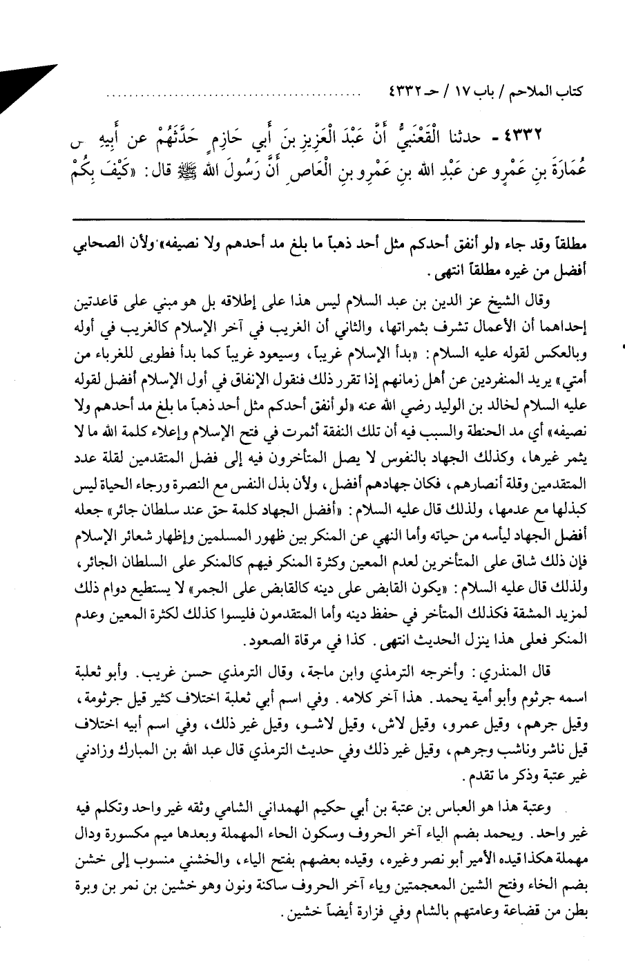 وَقَالَ الشَّيْخُ عِزُّ الدِّينِ بْنُ عَبْدِ السَّلَامِ لَيْسَ هَذَا عَلَى إِطْلَاقِهِ بَلْ هُوَ مَبْنِيٌّ عَلَى قَاعِدَتَيْنِ إِحْدَاهُمَا أَنَّ الْأَعْمَالَ تَشْرُفُ بِثَمَرَاتِهَا وَالثَّانِيَةُ أَنَّ الْغَرِيبَ فِي آخِرِ الْإِسْلَامِ كالغريب في أوله وبالعكس لقوله عليه السلام بَدَأَ الْإِسْلَامُ غَرِيبًا وَسَيَعُودُ غَرِيبًا كَمَا بَدَأَ فَطُوبَى لِلْغُرَبَاءِ مِنْ أُمَّتِي يُرِيدُ الْمُنْفَرِدِينَ عَنْ أَهْلِ زَمَانِهِمْ إِذَا تَقَرَّرَ ذَلِكَ فَنَقُولُ الْإِنْفَاقُ فِي أَوَّلِ الْإِسْلَامِ أَفْضَلُ لِقَوْلِهِ عَلَيْهِ السَّلَامُ لِخَالِدِ بْنِ الْوَلِيدِ رَضِيَ اللَّهُ عَنْهُ لَوْ أَنْفَقَ أَحَدُكُمْ مِثْلَ أُحُدٍ ذَهَبًا مَا بَلَغَ مَدَّ أَحَدِهِمْ وَلَا نَصِيفَهُ أَيْ مُدَّ الْحِنْطَةِ وَالسَّبَبُ فِيهِ أَنَّ تِلْكَ النَّفَقَةَ أَثْمَرَتْ فِي فَتْحِ الْإِسْلَامِ وَإِعْلَاءِ كَلِمَةِ اللَّهِ مَا لَا يُثْمِرُ غَيْرُهَا وَكَذَلِكَ الْجِهَادُ بِالنُّفُوسِ لَا يَصِلُ الْمُتَأَخِّرُونَ فِيهِ إِلَى فَضْلِ الْمُتَقَدِّمِينَ لِقِلَّةِ عَدَدِ الْمُتَقَدِّمِينَ وَقِلَّةِ أَنْصَارِهِمْ فَكَانَ جِهَادُهُمْ أَفْضَلَ وَلِأَنَّ بَذْلَ النَّفْسِ مَعَ النُّصْرَةِ وَرَجَاءِ الْحَيَاةِ لَيْسَ كَبَذْلِهَا مَعَ عَدَمِهَا وَلِذَلِكَ قَالَ عَلَيْهِ السَّلَامُ أفضل الجهاد كلمة حق عند سلطان جائر جَعَلَهُ أَفْضَلَ الْجِهَادِ لِيَأْسِهِ مِنْ حَيَاتِهِ وَأَمَّا النَّهْيُ عَنِ الْمُنْكَرِ بَيْنَ ظُهُورِ الْمُسْلِمِينَ وَإِظْهَارِ شَعَائِرِ الْإِسْلَامِ فَإِنَّ ذَلِكَ شَاقٌّ عَلَى الْمُتَأَخِّرِينَ لِعَدَمِ الْمُعِينِ وَكَثْرَةِ الْمُنْكَرِ فِيهِمْ كَالْمُنْكِرِ عَلَى السُّلْطَانِ الْجَائِرِ وَلِذَلِكَ قَالَ عَلَيْهِ السَّلَامُ يَكُونُ القابض كَالْقَابِضِ عَلَى الْجَمْرِ لَا يَسْتَطِيعُ دَوَامَ ذَلِكَ لِمَزِيدِ الْمَشَقَّةِ فَكَذَلِكَ الْمُتَأَخِّرُ فِي حِفْظِ دِينِهِ وَأَمَّا الْمُتَقَدِّمُونَ فَلَيْسُوا كَذَلِكَ لِكَثْرَةِ الْمُعِينِ وَعَدَمِ الْمُنْكَرِ فَعَلَى هَذَا يَنْزِلُ الْحَدِيثُ انْتَهَى