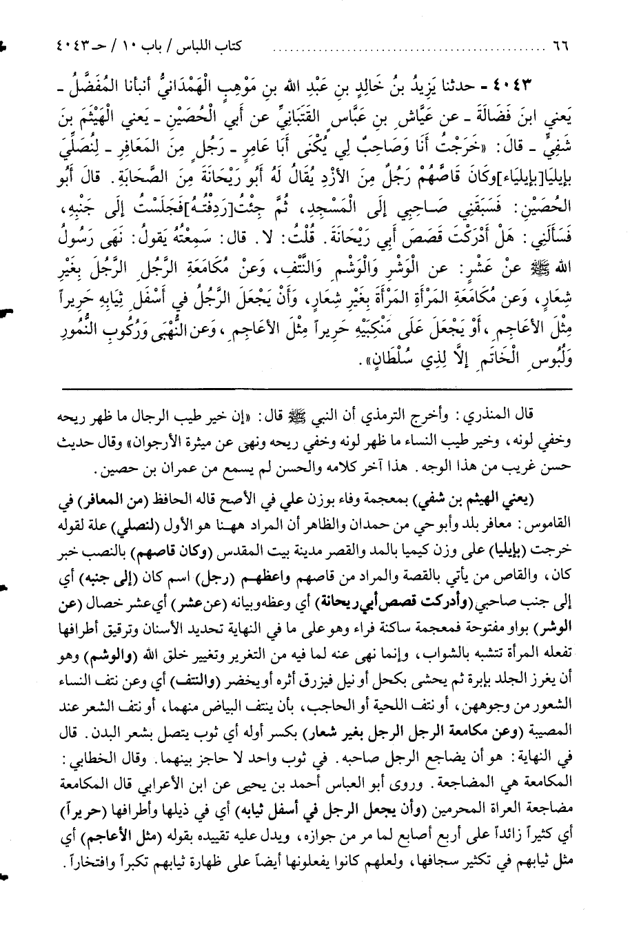 [4049] (يَعْنِي الْهَيْثَمَ بْنَ شَفِيٍّ) بِمُعْجَمَةٍ وَفَاءٍ بِوَزْنِ عَلِيٍّ فِي الْأَصَحِّ قَالَهُ الْحَافِظُ (مِنَ الْمَعَافِرِ) فِي الْقَامُوسِ مَعَافِرَ بَلَدٌ وَأَبُو حَيٍّ مِنْ حَمْدَانَ وَالظَّاهِرُ أَنَّ المراد هنا هو الأول (لنصلي) علة لقوله خرجت (بإيليا) عَلَى وَزْنِ كِيمْيَا بِالْمَدِّ وَالْقَصْرِ مَدِينَةُ بَيْتِ الْمَقْدِسِ (وَكَانَ قَاصَّهُمْ) بِالنَّصْبِ خَبَرُ كَانَ وَالْقَاصُّ مَنْ يَأْتِي بِالْقِصَّةِ وَالْمُرَادُ مِنْ قَاصَّهُمْ وَأَعْظَمَهُمْ (رَجُلٌ) اسْمُ كَانَ (إِلَى جَنْبِهِ) أَيْ إِلَى جَنْبِ صَاحِبِي (أَدْرَكْتُ قَصَصَ أَبِي رَيْحَانَةَ) أَيْ وَعْظَهُ وَبَيَانَهُ (عَنْ عَشْرٍ) أَيْ عَشْرِ خِصَالٍ (عَنِ الْوَشْرِ) بِوَاوٍ مَفْتُوحَةٍ فَمُعْجَمَةٍ سَاكِنَةٍ فَرَاءٍ وَهُوَ عَلَى مَا فِي النِّهَايَةِ تَحْدِيدُ الْأَسْنَانِ وَتَرْقِيقُ أَطْرَافِهَا تَفْعَلُهُ الْمَرْأَةُ تَتَشَبَّهُ بِالشَّوَابِّ وَإِنَّمَا نَهَى عَنْهُ لِمَا فِيهِ مِنِ التَّغْرِيرِ وَتَغْيِيرِ خَلْقِ اللَّهِ (وَالْوَشْمِ) وَهُوَ أَنْ يُغْرَزَ الْجِلْدُ بِإِبْرَةٍ ثُمَّ يُحْشَى بِكُحْلٍ أَوْ نِيلٍ فَيَزْرَقُّ أَثَرُهُ أَوْ يَخْضَرُّ (وَالنَّتْفِ) أَيْ وَعَنْ نَتْفِ النِّسَاءِ الشُّعُورَ مِنْ وُجُوهِهِنَّ أَوْ نَتْفِ اللِّحْيَةِ أَوِ الْحَاجِبِ بِأَنْ يُنْتَفَ الْبَيَاضُ مِنْهُمَا أَوْ نَتْفُ الشَّعْرِ عِنْدَ الْمُصِيبَةِ (وَعَنْ مُكَامَعَةِ الرَّجُلِ الرَّجُلَ بِغَيْرِ شِعَارٍ) بِكَسْرِ أَوَّلِهِ أَيْ ثَوْبٍ يَتَّصِلُ بِشَعْرِ الْبَدَنِ