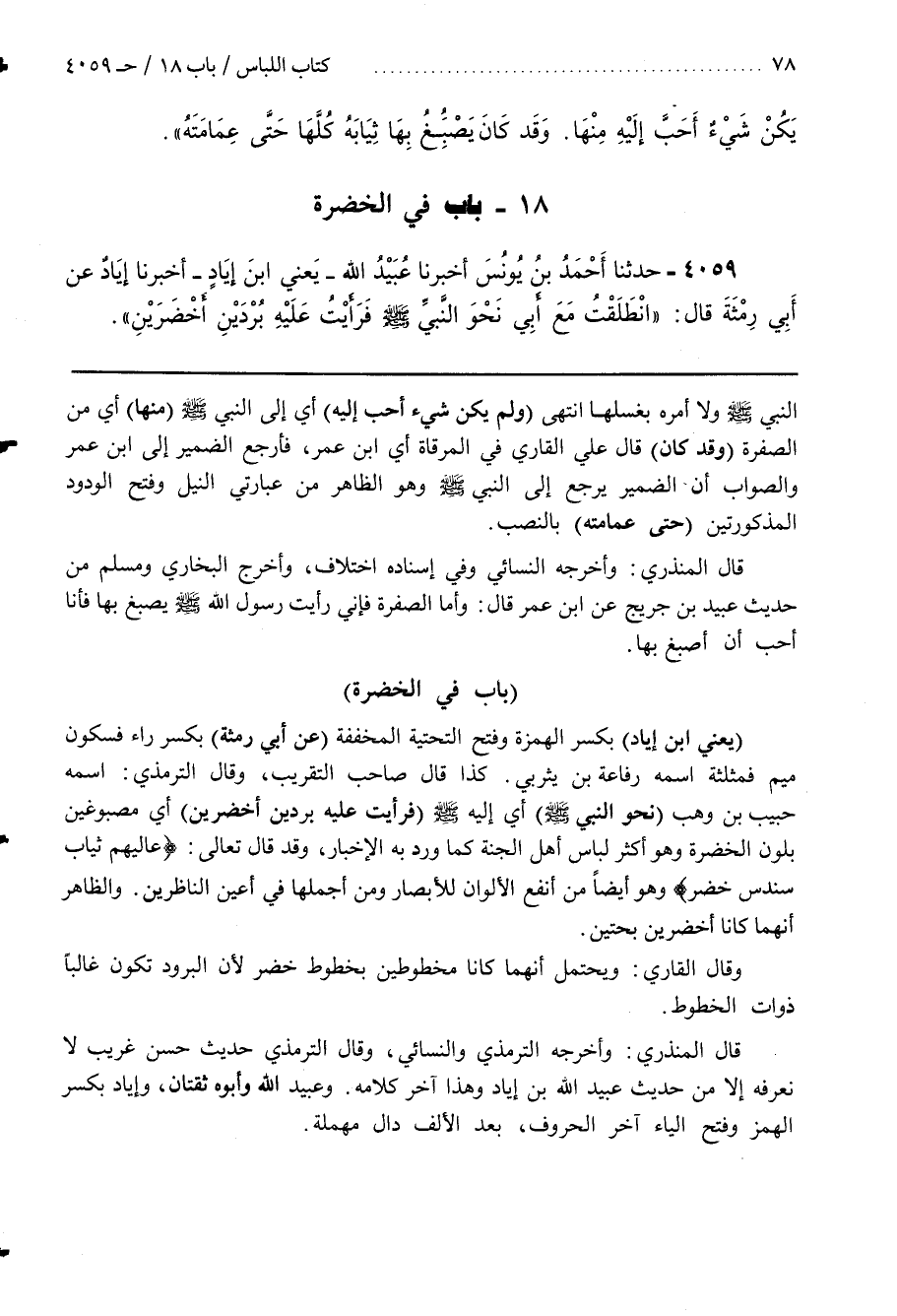 قَالَ الْمُنْذِرِيُّ وَأَخْرَجَهُ النَّسَائِيُّ وَفِي إِسْنَادِهِ اخْتِلَافٌ وَأَخْرَجَ الْبُخَارِيُّ وَمُسْلِمٌ مِنْ حَدِيثِ عُبَيْدِ بن جريج عن بن عُمَرَ قَالَ وَأَمَّا الصُّفْرَةُ فَإِنِّي رَأَيْتُ رَسُولَ اللَّهِ صَلَّى اللَّهُ عَلَيْهِ وَسَلَّمَ يَصْبُغُ بِهَا فَأَنَا أُحِبُّ أَنْ أَصْبُغَ بِهَا