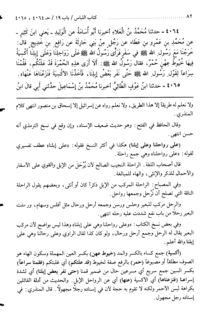 [4070] (عَلَى رَوَاحِلِنَا وَعَلَى إِبِلِنَا) هَكَذَا فِي أَكْثَرِ النُّسَخِ فَقَوْلُهُ عَلَى إِبِلِنَا عَطْفٌ تَفْسِيرِيٌّ لِقَوْلِهِ عَلَى رَوَاحِلِنَا وَهِيَ جَمْعُ رَاحِلَةٍ
