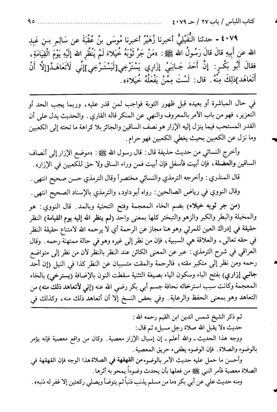 وَالْحَدِيثُ يَدُلُّ عَلَى أَنَّ الْقَدْرَ الْمُسْتَحَبَّ فِيمَا يَنْزِلُ إِلَيْهِ الْإِزَارُ هُوَ نِصْفُ السَّاقَيْنِ وَالْجَائِزُ بِلَا كَرَاهَةٍ مَا تَحْتَهُ إِلَى الْكَعْبَيْنِ وَمَا نَزَلَ عَنِ الْكَعْبَيْنِ بِحَيْثُ يُغَطِّي الْكَعْبَيْنِ فَهُوَ حَرَامٌ