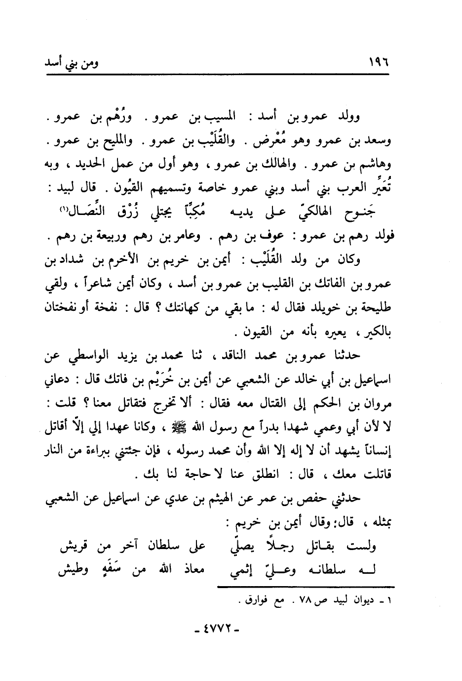 وهاشم بن عمرو. والهالك بن عمرو، وهو أول من عمل الحديد، وبه تعيّر العرب بني أسد وبني عمرو خاصة وتسميهم القيون. قال لبيد: