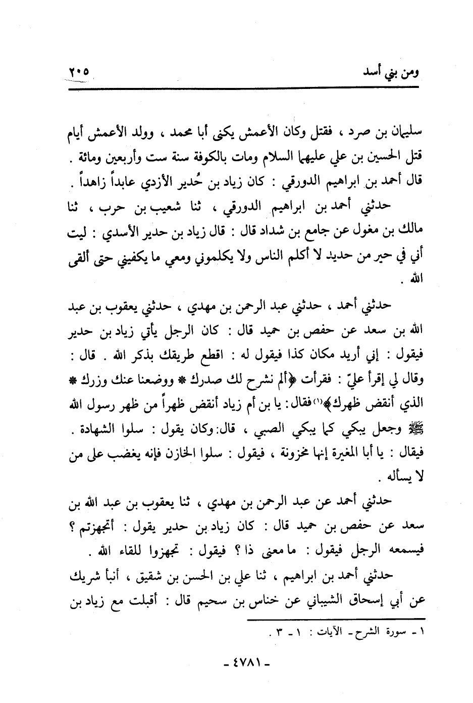 حدثني أحمد بن إبراهيم الدورقي، ثنا شُعَيْبُ بْنُ حَرْبٍ، ثنا مَالِكُ بْنُ مغول عن جامع بن شداد قال: قال زياد بن حدير الأسدي: ليت أني في حير من حديد لا أكلم الناس ولا يكلموني ومعي ما يكفيني حتى ألقى الله.
