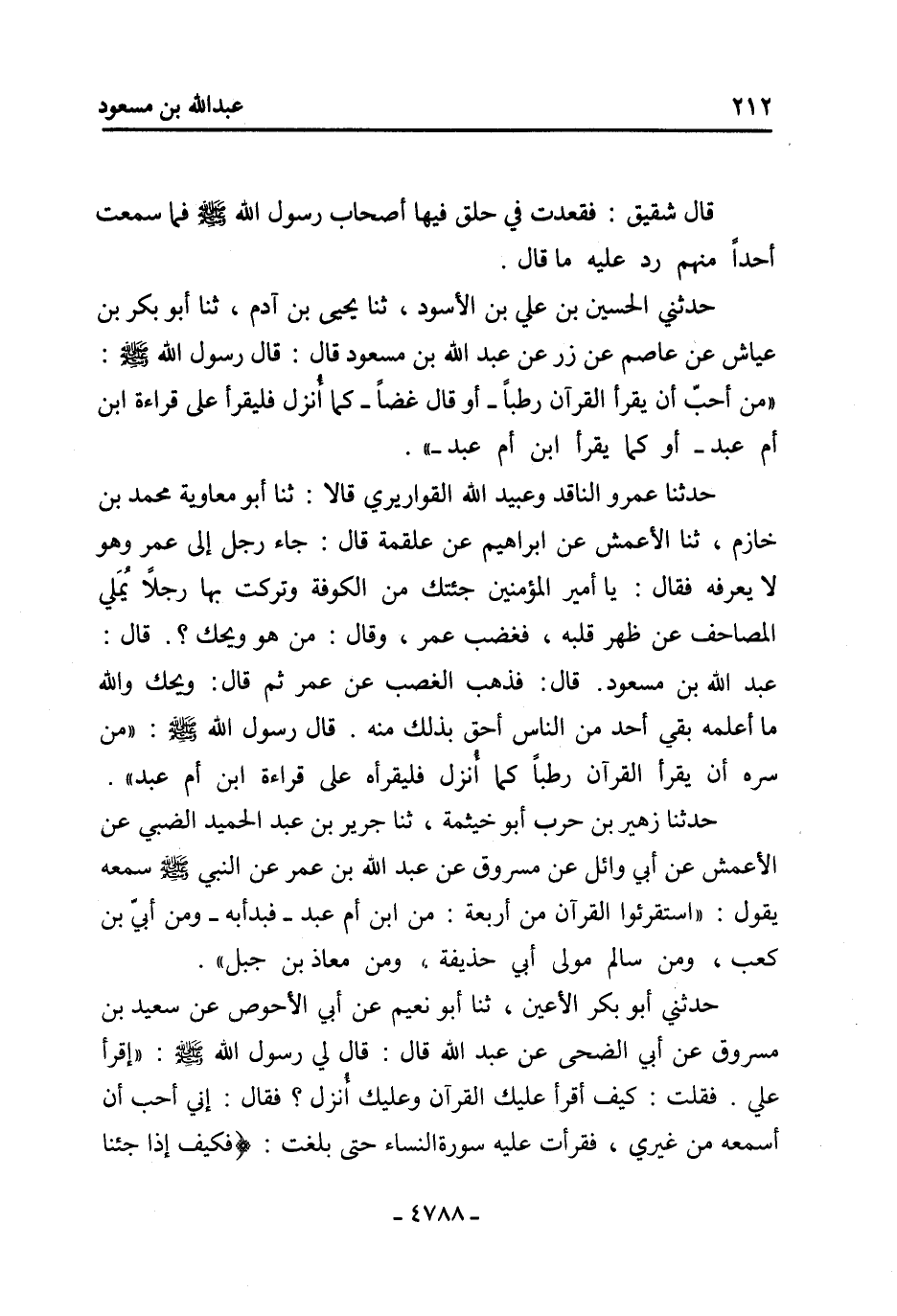 عَبْدُ الله بن مسعود. قال: فذهب الغصب عَنْ عُمَرَ ثُمَّ قَالَ: وَيْحَكَ وَاللَّهِ مَا أَعْلَمُهُ بَقِيَ أَحَدٌ مِنَ النَّاسِ أَحَقُّ بِذَلِكَ مِنْهُ. قَالَ رَسُولُ اللَّهِ صَلَّى اللَّهُ عَلَيْهِ وَسَلَّمَ: « [مَنْ سَرَّهُ أَنْ يَقْرَأَ الْقُرْآنَ رَطْبًا كَمَا أُنْزِلَ فَلْيَقْرَأْهُ عَلَى قِرَاءَةِ ابْنِ أُمِّ عَبْدٍ] » .