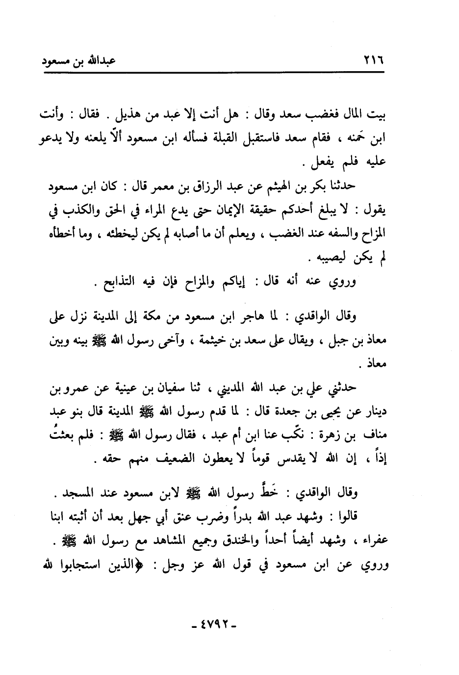 بَيْتِ الْمَالِ فَغَضِبَ سَعْدٌ وَقَالَ: هَلْ أَنْتَ إِلا عَبْدٌ مِنْ هُذَيْلٍ. فَقَالَ: وَأَنْتَ ابْنُ حَمْنَهْ، فَقَامَ سَعْدٌ فَاسْتَقْبَلَ الْقِبْلَةَ فَسَأَلَهُ ابْنُ مَسْعُودٍ أَلا يَلْعَنَهُ وَلا يَدْعُوَ عَلَيْهِ فَلَمْ يَفْعَلْ.