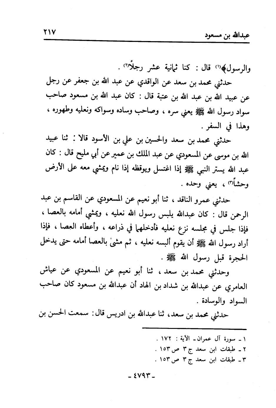 حَدَّثَنِي عَمْرٌو النَّاقِدُ، ثنا أَبُو نُعَيْمٍ عَنِ الْمَسْعُودِيِّ عن القاسم بن عبد الرحمن قال: كان عبد الله يلبس رسول الله نَعْلَيْهِ، وَيَمْشِي أَمَامَهُ بِالْعَصَا، فَإِذَا جَلَسَ فِي مَجْلِسِهِ نَزَعَ نَعْلَيْهِ فَأَدْخَلَهُمَا فِي ذِرَاعِهِ، وَأَعْطَاهُ الْعَصَا، فَإِذَا أَرَادَ رَسُولُ اللَّهِ صَلَّى اللَّهُ عَلَيْهِ وَسَلَّمَ أَنْ يَقُومَ أَلْبَسَهُ نَعْلَيْهِ، ثُمَّ مَشَى بِالْعَصَا أَمَامَهُ حَتَّى يَدْخُلَ الْحُجْرَةَ قَبْلَ رَسُول اللَّهِ صَلَّى اللَّهُ عَلَيْهِ وَسَلَّمَ.