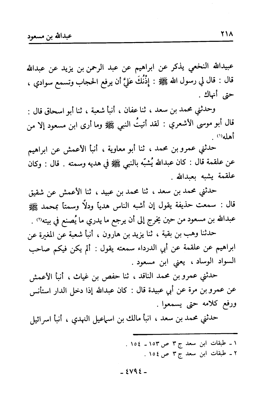 عُبَيْدِ اللَّهِ النَّخَعِيَّ يَذْكُرُ عَنْ إِبْرَاهِيمَ عَنْ عَبْدِ الرَّحْمَنِ بْنِ يَزِيدَ عَنْ عَبْدِ اللَّهِ قَالَ: قَالَ لِي رَسُولُ اللَّهِ صَلَّى اللَّهُ عَلَيْهِ وَسَلَّمَ: [إِذْنُكَ عَلَيَّ أَنْ يُرْفَعَ الْحِجَابُ وَتَسْمَعُ سَوَادِي، حَتَّى أَنْهَاكَ] .