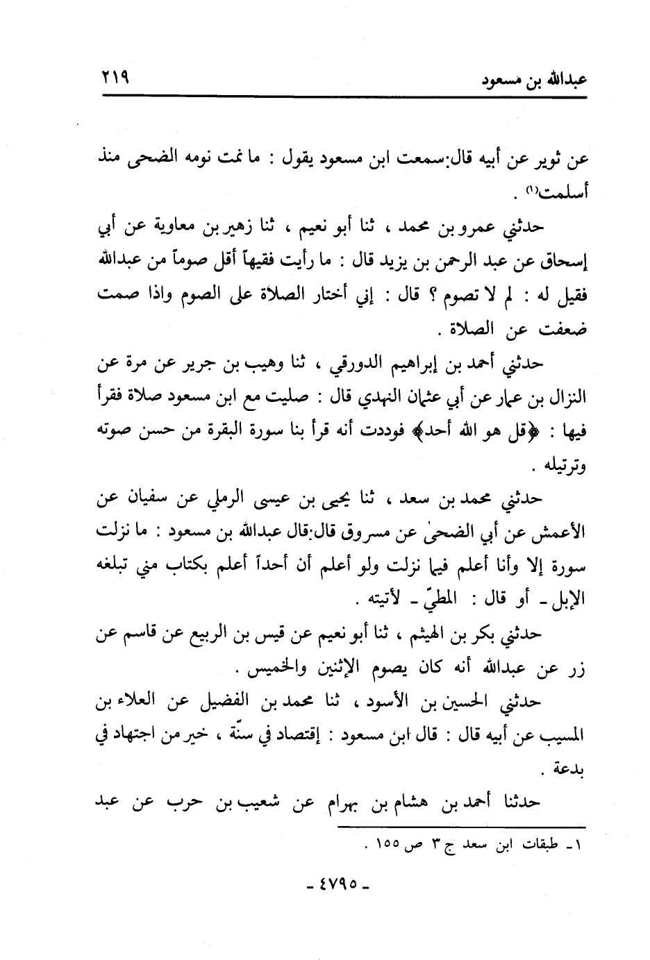 حَدَّثَنِي عَمْرُو بْنُ مُحَمَّدٍ، ثنا أَبُو نُعَيْمٍ، ثنا زُهَيْرُ بْنُ مُعَاوِيَةَ عَنْ أَبِي إِسْحَاقَ عَنْ عَبْدِ الرَّحْمَنِ بْنِ يَزِيدَ قَالَ: مَا رَأَيْتُ فَقِيهًا أَقَلَّ صَوْمًا مِنْ عَبْدِ اللَّهِ فَقِيلَ لَهُ: لِمَ لا تَصُومُ؟ قَالَ: إِنِّي أَخْتَارُ الصَّلاةَ عَلَى الصَّوْمِ وَإِذَا صُمْتُ ضَعُفْتُ عَنِ الصَّلاةِ.